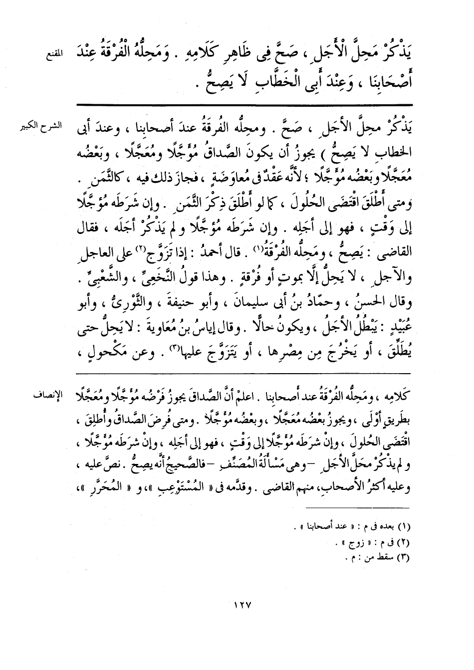 كَلامِه، ومَحِلُّه الفُرْقَةُ عند أصحابِنا. اعلمْ أنَّ الصَّداقَ يجوزُ فَرْضُه مُؤجَّلًا ومُعَجَّلًا بطَريقٍ أوْلَى، ويجوزُ بعْضُه مُعَجَّلًا، وبعْضُه مُؤجَّلًا. ومتى فُرِضَ الصَّداقُ وأُطلِقَ، اقْتَضَى الحُلولَ، وإنْ شرَطَه مُؤجَّلًا إلى وَقْتٍ، فهو إلى أجَلِه، وإنْ شرَطَه مُؤجَّلًا، ولم يذْكُرْ محَلَّ الأجَلِ -وهي مَسْألَةُ المُصَنِّفِ- فالصَّحيحُ أنَّه يصِحُّ. نصَّ عليه، وعليه أكثرُ الأصحابِ، منهم القاضي. وقدَّمه في «المُسْتَوعِبِ»، و «المُحَرَّرِ»،