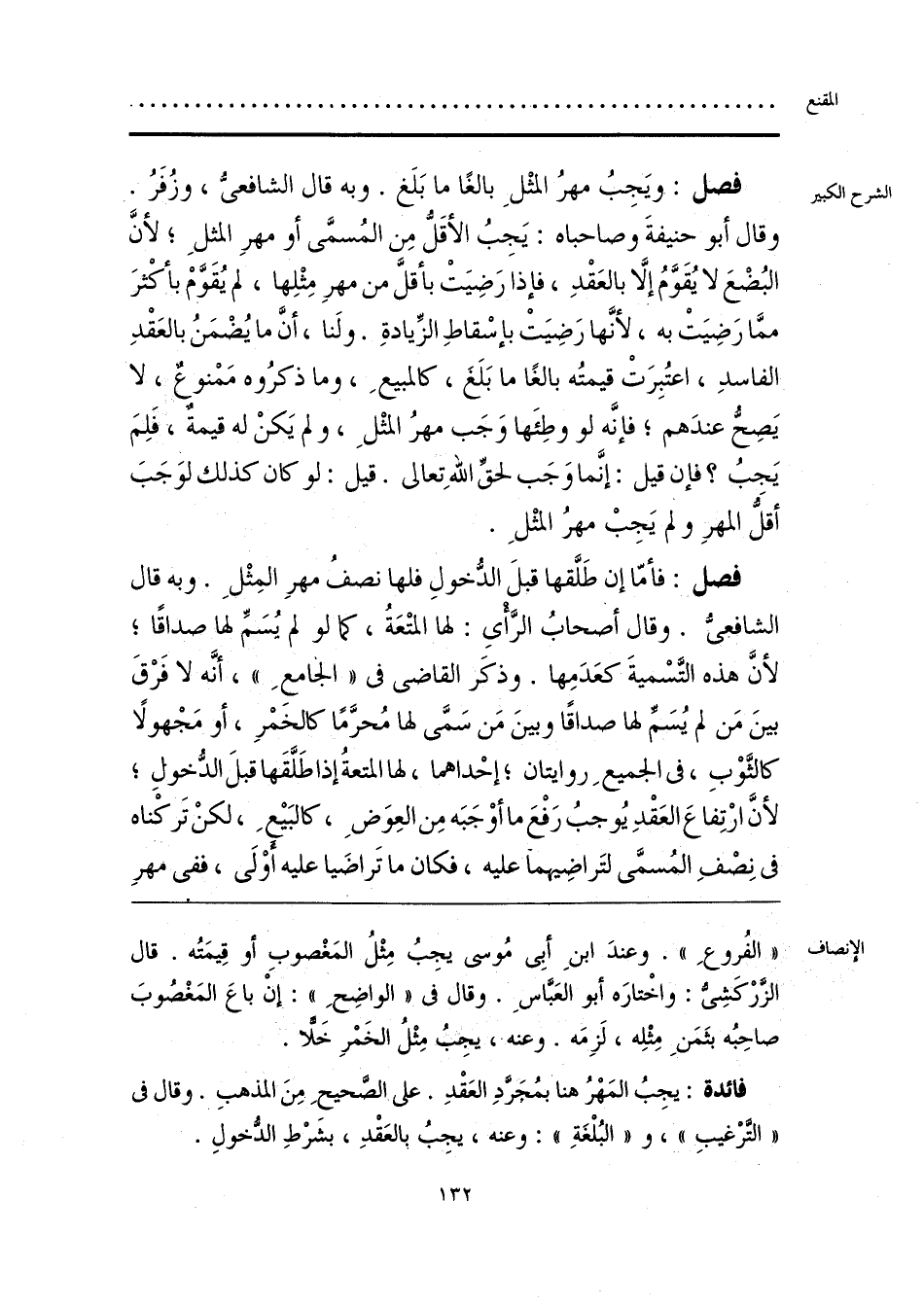 فائدة: يجِبُ المَهْرُ هنا بمُجَرَّدِ العَقْدِ. على الصَّحيحِ مِنَ المذهبِ. وقال في «التّرْغيبِ»، و «البُلْغَةِ»: وعنه، يجِبُ بالعَقْدِ، بشَرْطِ الدُّخولِ.