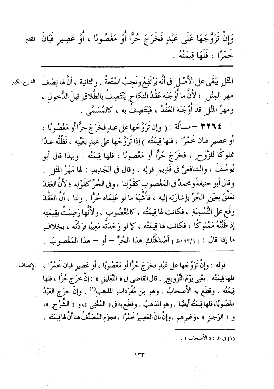قوله: وإنْ تَزَوَّجَها على عَبْدٍ فخَرَجَ حُرًّا أو مَغْصُوبًا، أو عَصيرٍ فبان خَمْرًا، فلها قِيمَتُه. يعْنِي يوْمَ التَّزْويجِ. قال القاضي في «التَّعْليقِ»: إنْ خرَج حُرًّا، فلها قِيمَتُه. وقطَع به الأصحابُ. وهو مِن مُفْرَداتِ المذهبِ (¬1). وإنْ خرَج العَبْدُ مغْصُوبًا، فلها قِيمَتُه أَيضًا. وهو المذهبُ. وقطَع به في «المُغْنِي»، و «الشرْحِ»، و «الوَجيزِ»، وغيرِهم. وإنْ بانَ العَصِيرُ خَمْرًا، فجزَم المُصَنِّفُ هنا أنَّ لها قِيمَتَه.