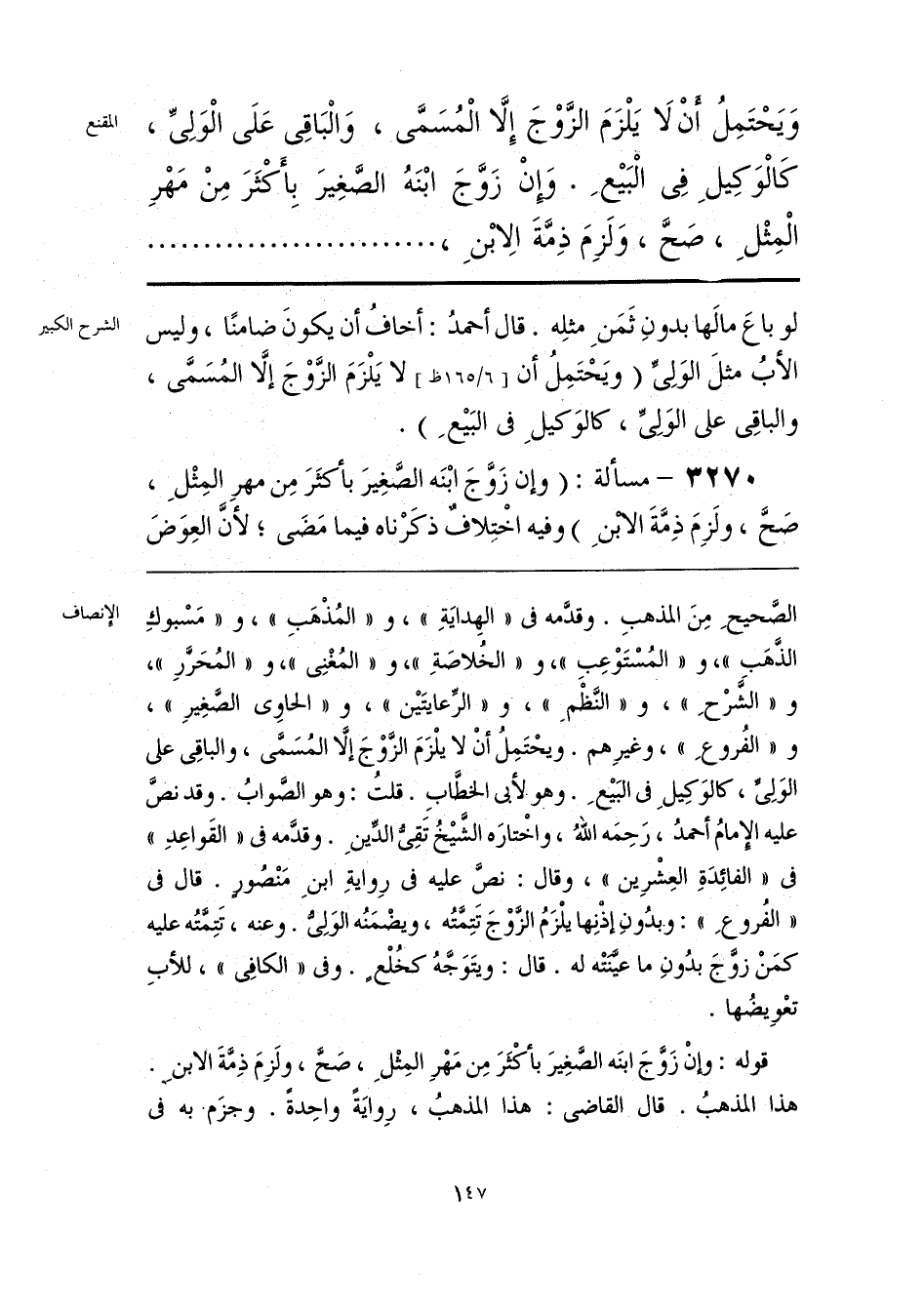 الصَّحيحِ مِنَ المذهبِ. وقدَّمه في «الهِدايَةِ»، و «المُذْهَبِ»، و «مَسْبوكِ الذَّهَب»، و «المُسْتَوْعِبِ»، و «الخُلاصَةِ»، و «المُغْنِي»، و «المُحَرَّرِ»، و «الشَّرْحِ»، و «النَّظْمِ»، و «الرِّعايتَين»، و «الحاوي الصَّغِيرِ»، و «الفُروعِ»، وغيرِهم. ويحْتَمِلُ أنْ لا يلْزَمَ الزَّوْجَ إلَّا المُسَمَّى، والباقِي على الوَلِيِّ، كالوَكِيلِ في البَيعِ. وهو. لأبي الخطَّابِ. قلتُ: وهو الصَّوابُ. وقد نصَّ عليه الإمامُ أحمدُ، رَحِمَه اللهُ، واخْتارَه الشَّيخُ تَقِيُّ الدِّينِ. وقدَّمه في «القَواعِدِ» في «الفائِدَةِ العِشْرِين»، وقال: نصَّ عليه في رِوايةِ ابنِ مَنْصُورٍ. قال في «الفُروعِ»: وبدُونِ إذْنِها يلْزَمُ الزَّوْجَ تَتِمَّتُه، ويضْمَنُه الوَلِي. وعنه، تَتِمَّتُه عليه كمَنْ زوَّجَ بدُونِ ما عيَّنَتْه له. قال: ويتَوَجَّهُ كخُلْعٍ. وفي «الكافِي»، للأبِ تعْويضُها.