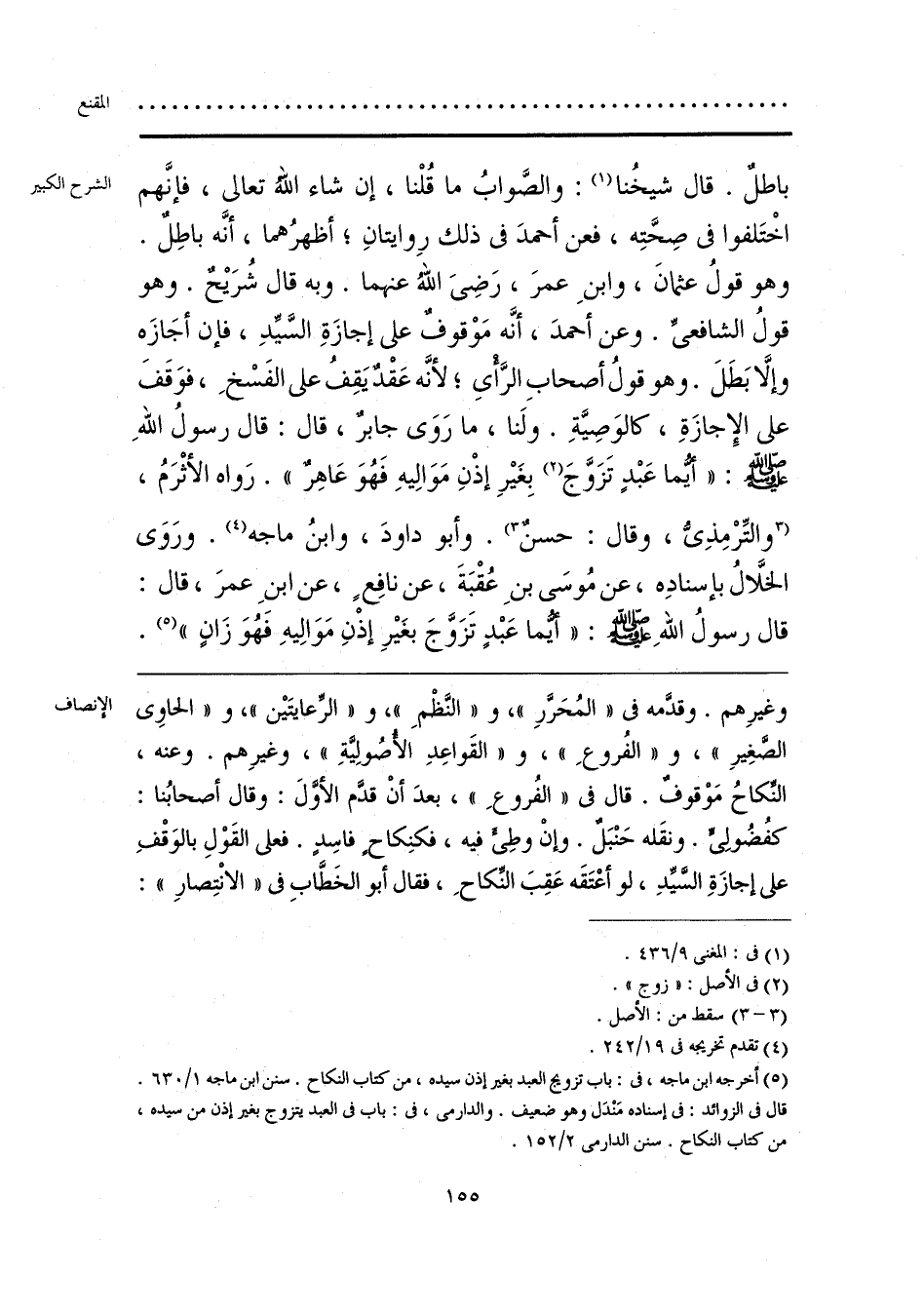 وغيرِهم. وقدَّمه في «المُحَرَّرِ»، و «النَّظْمِ»، و «الرِّعايتَين»، و «الحاوي الصَّغِيرِ»، و «الفُروعِ»، و «القَواعِدِ الأصُولِيَّةِ»، وغيرِهم. وعنه، النِّكاحُ مَوْقوفٌ. قال في «الفُروعِ»، بعدَ أنْ قدَّم الأوَّلَ: وقال أصحابُنا: كفُضُولِيٍّ. ونقَله حَنْبَلٌ. وإنْ وطِئ فيه، فكنِكاحٍ فاسِدٍ. فعلى القَوْلِ بالوَقْفِ على إجازَةِ السَّيِّدِ، لو أعْتَقَه عَقِبَ النِّكاحِ، فقال أبو الخَطَّابِ في «الانْتِصارِ»: