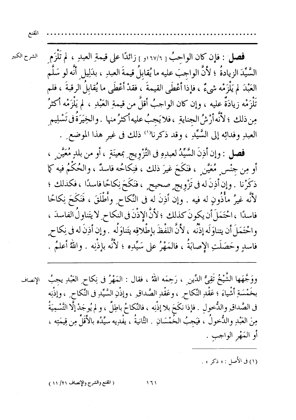 ووَجَّهَها الشَّيخُ تَقِيُّ الدِّينِ، رَحِمَه اللهُ، فقال: المَهْرُ في نِكاحِ العَبْدِ يجِبُ بخَمْسَةِ أشْياءَ؛ عَقْدِ النِّكاحِ، وعَقْدِ الصَّداقِ، وإذْنِ السَّيِّدِ في النِّكاحِ، وإذْنِه في الصَّداقِ والدُّخولِ. فإذا نكَحَ بلا إذْنِه، فالنِّكاحُ باطِلٌ، ولم يُوجَدْ إلَّا التَّسْمِيَةُ مِنَ العَبْدِ والدُّخولُ، فيَجِبُ الخُمْسَانِ. الثَّانيةُ، يفدِيه سيِّدُه بالأقَل مِن قِيمَتِه، أو المَهْرِ الواجبِ.