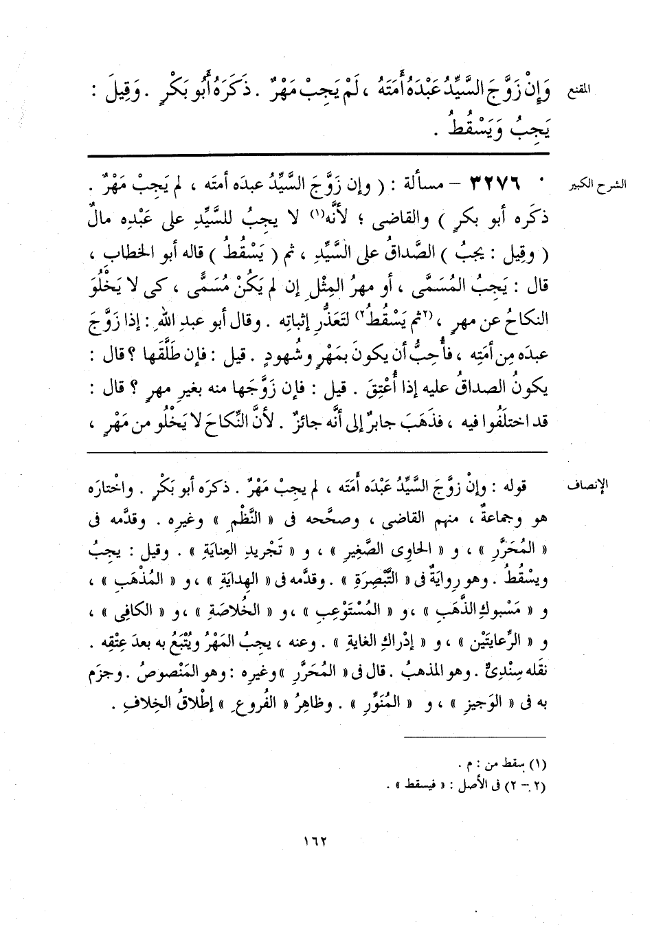 قوله: وإنْ زوَّجَ السَّيِّدُ عَبْدَه أمَتَه، لم يجِبْ مَهْرٌ. ذكرَه أبو بَكْرٍ. واخْتارَه هو وجماعةٌ، منهم القاضي، وصحَّحه في «النَّظْمِ» وغيرِه. وقدَّمه في «المُحَررِ»، و «الحاوي الصَّغِيرِ»، و «تَجْريدِ العِنايَةِ». وقيل: يجِبُ ويسْقُطُ. وهو رِوايَةٌ في «التبصِرَةِ». وقدَّمه في «الهِدايَةِ»، و «المُذْهَبِ»، و «مَسْبوكِ الذَّهَبِ»، و «المُسْتَوْعِبِ»، و «الخُلاصَةِ»، و «الكافِي»، و «الرِّعايتَين»، و «إدْراكِ الغايةِ». وعنه، يجِبُ المَهْرُ ويُتْبَعُ به بعدَ عِتْقِه. نقَله سِنْدِيٌّ. وهو المذهبُ. قال في «المُحَرَّرِ» وغيرِه: وهو المَنْصوصُ. وجزَم به في «الوَجيزِ»، و «المُنَوِّرِ». وظاهِرُ «الفُروعِ» إطْلاقُ الخِلافِ.