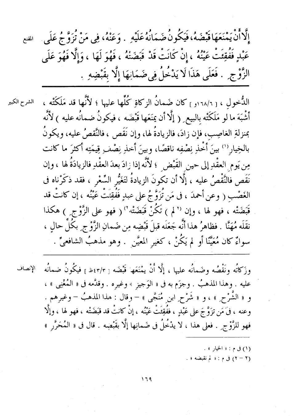 وزَكاتُه نَقْصُه وضمانُه عليها، إلَّا أنْ يمْنَعَها قَبْضَه فيكُونُ ضمانُه عليه. وهذا المذهبُ. وجزَم به في «الوَجيزِ» وغيرِه. وقدَّمه في «المُغْنِي»، و «الشَّرْحِ»، و «شَرْحِ ابنِ مُنَجَّى» -وقال: هذا المذهبُ- وغيرِهم. وعنه، في مَن تزَوَّجَ على عَبْدٍ، ففُقِئَتْ عَينُه، إنْ كانتْ قد قبَضَتْه، فهو لها، وإلَّا فهو للزَّوْجِ. فعلى هذا، لا يدْخُلُ في ضَمانِها إلَّا بقَبْضِه. قال في «المُحَرَّرِ»