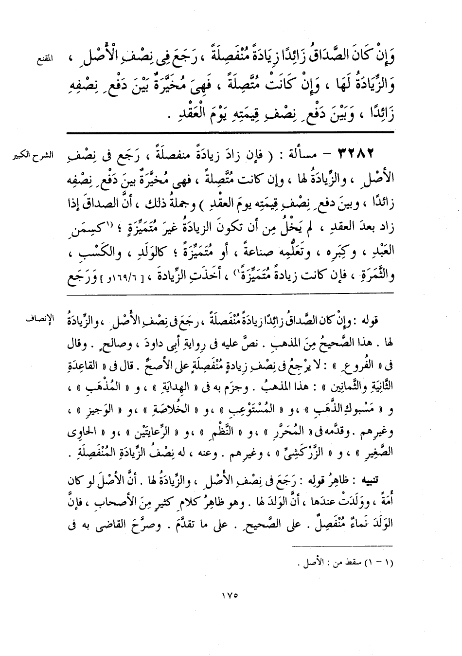 قوله: وإنْ كان الصَّداقُ زائِدًا زيادَةً مُنْفَصلَةً، رجَعَ في نِصفِ الأصْلِ، والزِّيادَةُ لها. هذا الصَّحيحُ مِنَ المذهبِ. نصَّ عليه في رِوايةِ أبِي داودَ، وصالحٍ. وقال في «الفُروعِ»: لا يرْجِعُ في نِصفِ زِيادةٍ مُنْفَصِلَةٍ على الأصح. قال في «القاعِدَةِ الثَّانِيَةِ والثَّمانِين»: هذا المذهبُ. وجزَم به في «الهِدايَةِ»، و «المُذْهَبِ»، و «مَسْبوكِ الذَّهَبِ»، و «المُسْتَوْعِبِ»، و «الخُلاصَةِ»، و «الوَجيزِ»، وغيرِهم. وقدَّمه في «المُحَرَّرِ»، و «النَّظْمِ»، و «الرِّعايتَين»، و «الحاوي الصَّغِيرِ»، و «الزَّرْكَشِيُّ»، وغيرِهم. وعنه، له نِصفُ الزِّيادَةِ المُنْفَصِلَةِ.