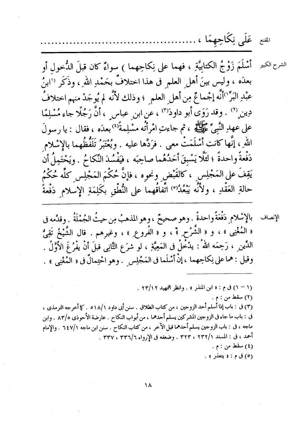 بالإِسْلامِ دَفْعَةً واحدةً. وهو صحيحٌ، وهو المذهبُ مِن حيثُ الجُمْلَةُ. وقدَّمه في «المُغْنِي»، و «الشَّرْحِ»، و «الفُروعِ»، وغيرِهم. قال الشَّيخُ تَقِيُّ الدِّينِ، رَحِمَه اللهُ: يدْخُلُ في المَعِيَّةِ، لو شرَع الثَّانِي قبلَ أنْ يفْرُغَ الأوَّلُ. وقيل: هما على نِكاحِهما، إنْ أسْلَما في المَجْلِسِ. وهو احْتِمالٌ في «المُغْنِي».