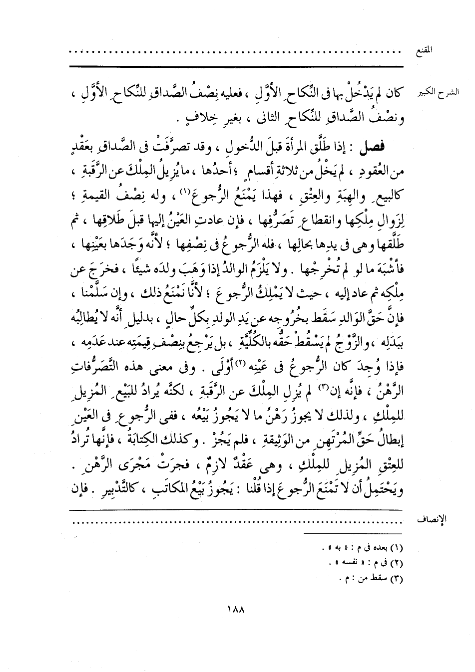 فصل: إذا طَلَّق المرأةَ قبلَ الدُّخولِ، وقد تصرَّفَتْ في الصَّداقِ بعَقْدٍ من العُقودِ، لم يَخْلُ من ثلاثةِ أقسام، أحدُها، ما يُزِيلُ المِلْكَ عن الرَّقَبةِ، كالبيعِ والهِبَةِ والعِتْقِ، فهذا يَمنَعُ الرُّجوعَ (¬1)، وله نِصْفُ القيمةِ؛ لِزَوالِ مِلْكِها وانقطاعِ تَصَرُّفِها، فإن عادتِ العَيْنُ إليهِا قبلَ طَلاقِها، ثم طَلَّقها وهى في يدِها بحالِها، فله الرُّجوعُ في نِصْفِها، لأنَّه وَجَدَها بعَيْنِها، فأشْبَهَ ما لو لم تُخْرِجْها. ولا يَلْزَمُ الوالدُ إذا وَهَبَ ولدَه شيئًا، فخرَجَ عن مِلْكِه ثم عاد إليه، حيث لا يَمْلِكُ الرُّجوعَ؛ لأنَّا نَمْنَعُ ذلك، وإن سَلَّمْنا، فإنَّ حَقَّ الوَالدِ سَقَط بخُرُوجه عن يَدِ الولدِ بِكلِّ حالٍ، بدليلِ أنَّه لا يُطالِبُه ببَدَلِه، والزَّوْجُ لم يَسْقُطْ حَقُّه بالكُلِّيَّةِ، بل يَرْجِعُ بنِصْفِ قِيمَتِه عند عَدَمِه، فإذا وُجِدَ كان الرُّجوعُ في عَيْنِه (¬2) أوْلَى. وفى معنى هذه التَّصَرُّفاتِ الرَّهْنُ، فإنَّه إن (¬3) لم يُزِلِ المِلْكَ عن الرَّقَبةِ، لكنَّه يُرادُ للبَيْعِ المُزِيلِ للمِلْكِ، ولذلك لا يجوزُ رَهْنُ ما لا يَجُوزُ بَيْعُه، ففى الرُّجوعِ في العَيْنِ إبطالُ حَقِّ المُرْتَهِنِ من الوَثِيقةِ، فلم يَجُزْ. وكذلك الكِتابَةُ، فإنَّها تُرادُ للعِتْقِ المُزِيلِ للمِلْكِ، وهى عَقْدٌ لازِم، فجرَتْ مَجْرَى الرَّهْنِ.