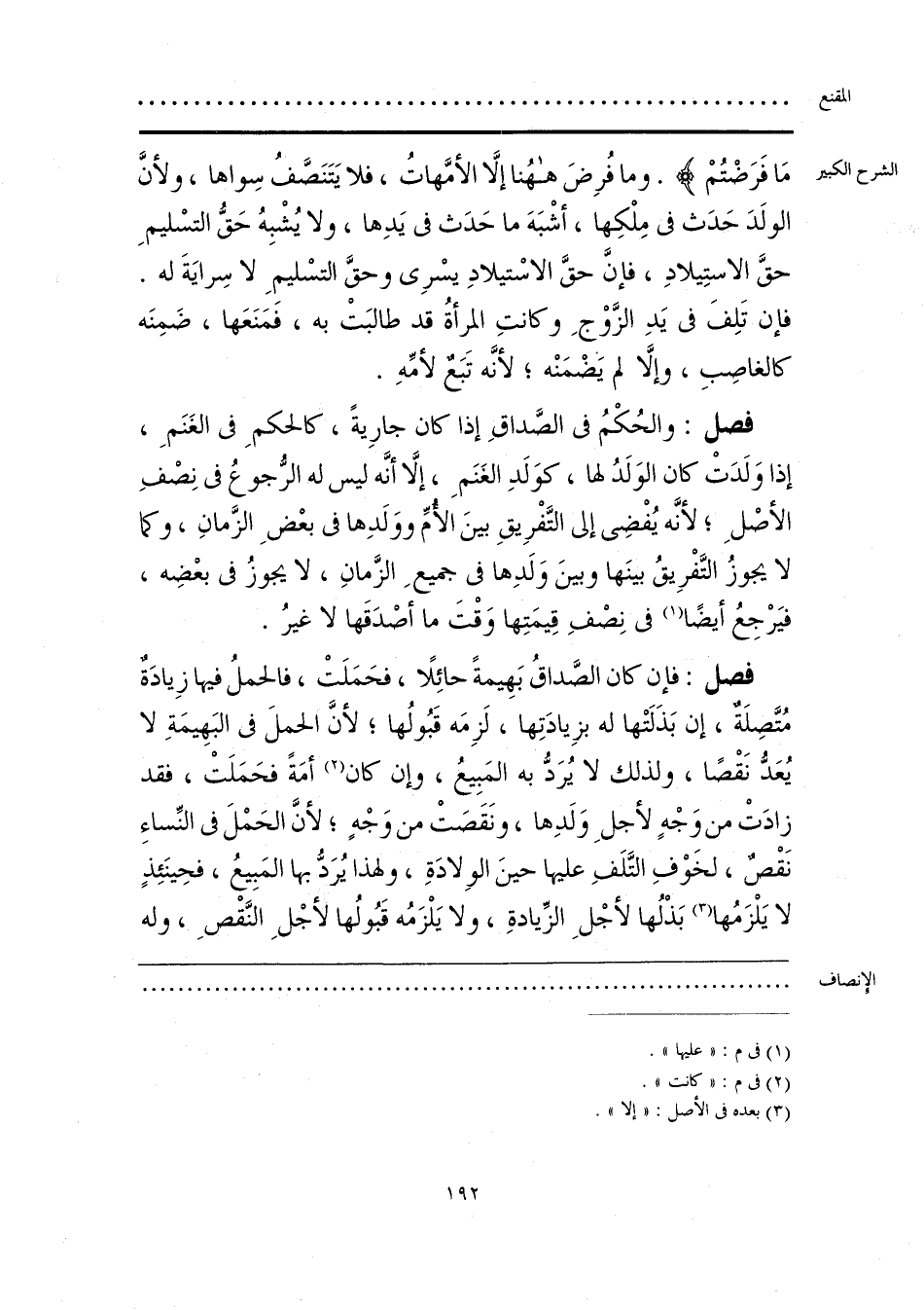 مَا فَرَضْتُمْ}. وما فُرِضَ ههُنا إلَّا الأمَّهاتُ، فلا يَتَنَصَّفُ سِواها، ولأَنَّ الولَدَ حَدَث في مِلْكِها، أشْبَهَ ما حَدَث في يَدِها، ولا يُشْبِهُ حَقُّ التسْليمِ حقَّ الاستِيلادِ، فإنَّ حقَّ الاسْتيلادِ يسْرِى وحقَّ التسْليمِ لا سِرايَةَ له. فإن تَلِفَ في يَدِ الزَّوْجِ وكانتِ المرأةُ قد طالبَتْ به، فَمَنَعَها، ضَمِنَه كالغاصِبِ، وإلَّا لم يَضْمَنْه؛ لأنَّه تَبَعٌ لأمِّهِ.