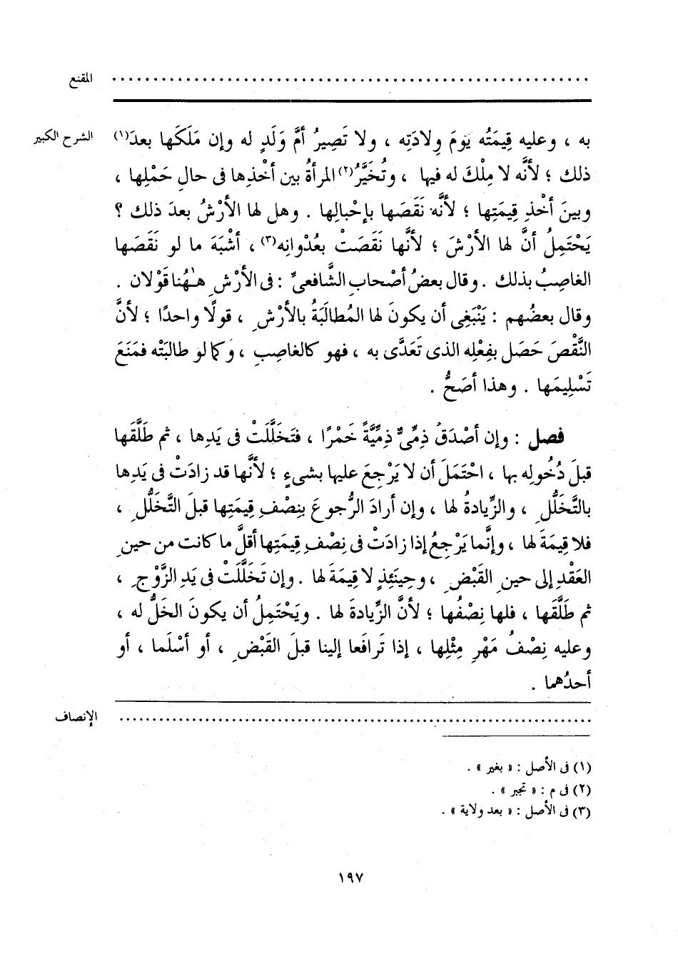 فصل: وإن أصْدَقُ ذِمِّىٌّ ذِمِّيَّةً خَمْرًا، فتَخَلَّلَتْ في يَدِها، ثم طَلَّقَها قبلَ دُخُولِه بها، احْتَمَلَ أن لا يَرْجِعَ عليها بشئٍ؛ لأنَّها قد زادَتْ في يَدِها بالتَّخَلُّلِ، والزِّيادةُ لها، وإن أرادَ الرُّجوعَ بنِصْفِ قِيمَتِها قبلَ التَّخَلُّلِ، فلا قِيمَةَ لها، وإنَّما يَرْجِعُ إذا زادَتْ في نِصْفِ قِيمَتِها أقلَّ ما كانت من حينِ العَقْدِ إلى حينِ القَبْضِ، وحِينَئِذٍ لا قِيمَةَ لها. وإن تَخَلَّلَتْ في يَدِ الزَّوْجِ، ثم طَلَّقَها، فلها نِصْفُها؛ لأَنَّ الزِّيادةَ لها. ويَحْتَمِلُ أن يكونَ الخَلُّ له، وعليه نِصْفُ مَهْرِ مِثْلِها، إذا تَرافَعا إلينا قبلَ القَبْضِ، أو أسْلَما، أو أحدُهما.