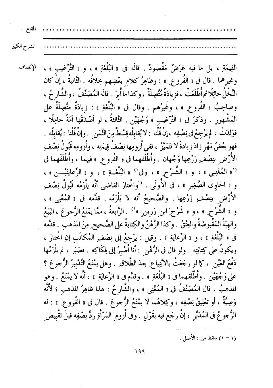 القِيمَةِ، بل ما فيه غرَضٌ مَقْصودٌ. قالَه فى «البُلْغَةِ»، و «التَّرْغيبِ»، وغيرِهما. قال فى «الفُروعِ»: وظاهِرُ كلامِ بعْضِهم خِلافُه. الثَّانيةُ، إنْ كان النّخْلُ حائِلًا ثم أَطْلَعَتْ، فزِيادَةٌ مُتَّصِلَةٌ، وكذا ما أُبِرَ. قالَه المُصَنِّفُ، والشَّارِحُ، وصاحِبُ «الفُروعِ»، وغيرُهم. وقال فى «البُلْغَةِ»: زِيادَةٌ متَّصِلَةٌ على المَشْهورِ. وذكرَ فى «التَّرْغيبِ» وَجْهَيْن. الثَّالثةُ، لو أصْدَقَها أمَةً حامِلًا، فوَلدَتْ، لم يرْجِعْ فى نِصْفِه، إنْ قُلْنا: لا يُقابِلُه قِسْطٌ مِنَ الثَّمَنِ. وإنْ قُلْنا: يُقابِلُه. فهو بعْضُ مَهْرٍ زادَ زِيادةً لا تتَمَيَّزُ، ففى لُزومِها نِصْفُ قِيمَتِه، ولُزومِه قَبُولُ نِصْفِ الأَرْضِ بنِصْفِ زَرْعِها وَجْهان. وأَطْلَقهما فى «الفُروعِ» فيهما، وأطْلَقَهما فى [«المُغْنِى»، و «الشَّرْحِ»، وفى] (1) «البُلْغَةِ»، و «الرِّعايتَيْن»، و «الحاوِى الصَّغِيرِ»، فى الأُولَى. [واخْتارَ القاضى أنَّه يلْزَمُه قَبُولُ نِصْفِ الأَرْض بنِصْفِ زَرْعِها. والصَّحيحُ أنه لا يَلْزَمُه. قدَّمه فى «المُغْنِى»، و «الشَّرْحِ»، و «شَرْحِ ابنِ رَزِينٍ»] (¬1). الرَّابعةُ، ممَّا يمْنَعُ الرُّجوعَ، البَيْعُ والهِبَةُ المَقْبوضَةُ والعِتْقُ. وكذا الرَّهْنُ والكِتابةُ على الصَّحيحِ مِنَ المذهبِ. قدَّمه فى «البُلْغَةِ»، و «الرِّعايَةِ». وقيل: يرْجعُ إلى نِصْفِ المُكاتَبِ إنِ اخْتارَ، ويكونُ على كِتابَتِه. ولو قال فى الرَّهْنِ: أنا أَصْبِرُ إلى فِكَاكِه. فصَبَر، لم يلْزَمْها دَفْعُ العَيْنِ، كما لو رجَعَتْ بالابْتِياعِ بعدَ الطَّلاقِ. وهل يمْنَعُ التَّدْبِيرُ الرُّجوعَ؟ على وَجْهَيْن. وأَطلَقهما فى «البُلْغَةِ». وقدَّم فى «الرِّعايَةِ»، أنَّه لا يمْنَعُ. وهو المذهبُ. قال المُصَنِّفُ فى «المُغْنِى»، والشَّارِحُ: هذا ظاهِرُ المذهبِ؛ لأنَّه وَصِيَّةٌ، أو تعْلِيقُ نِصْفِه، وكِلاهُما لا يمْنَعُ الرُّجوعَ. قال فى «الفُروعِ»: له الرُّجوعُ فى المُدَبَّرِ، إنْ رجَع فيه بقَوْلٍ. وفى لُزومِ المَرْأةِ ردُّ نِصْفِه قبل تقْبِيض