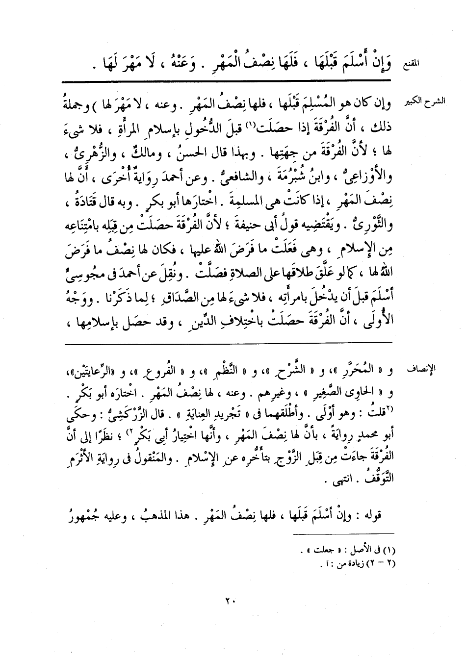 و «المُحَرَّرِ»، و «الشَّرْحِ»، و «النَّظْمِ»، و «الفُروعِ»، و «الرِّعايتَين»، و «الحاوي الصَّغِيرِ»، وغيرِهم. وعنه، لها نِصْفُ المَهْرِ. اخْتارَه أبو بَكْرٍ. [قلتُ: وهو أوْلَى. وأطْلَقهما في «تَجْريدِ العِنايَةِ». قال الزَّرْكَشِيُّ: وحكَى أبو محمدٍ رِوايَةً، بأنَّ لها نِصْفَ المَهْرِ، وأنَّها اخْتِيارُ أبِي بَكْرٍ] (¬1)؛ نظَرًا إلى أنَّ الفُرْقَةَ جاءَتْ مِن قِبَلِ الزَّوْجِ بتأَخُّرِه عنِ الإِسْلامِ. والمَنْقولُ في رِوايَةِ الأثْرَمِ التَّوَقُّفُ. انتهى.