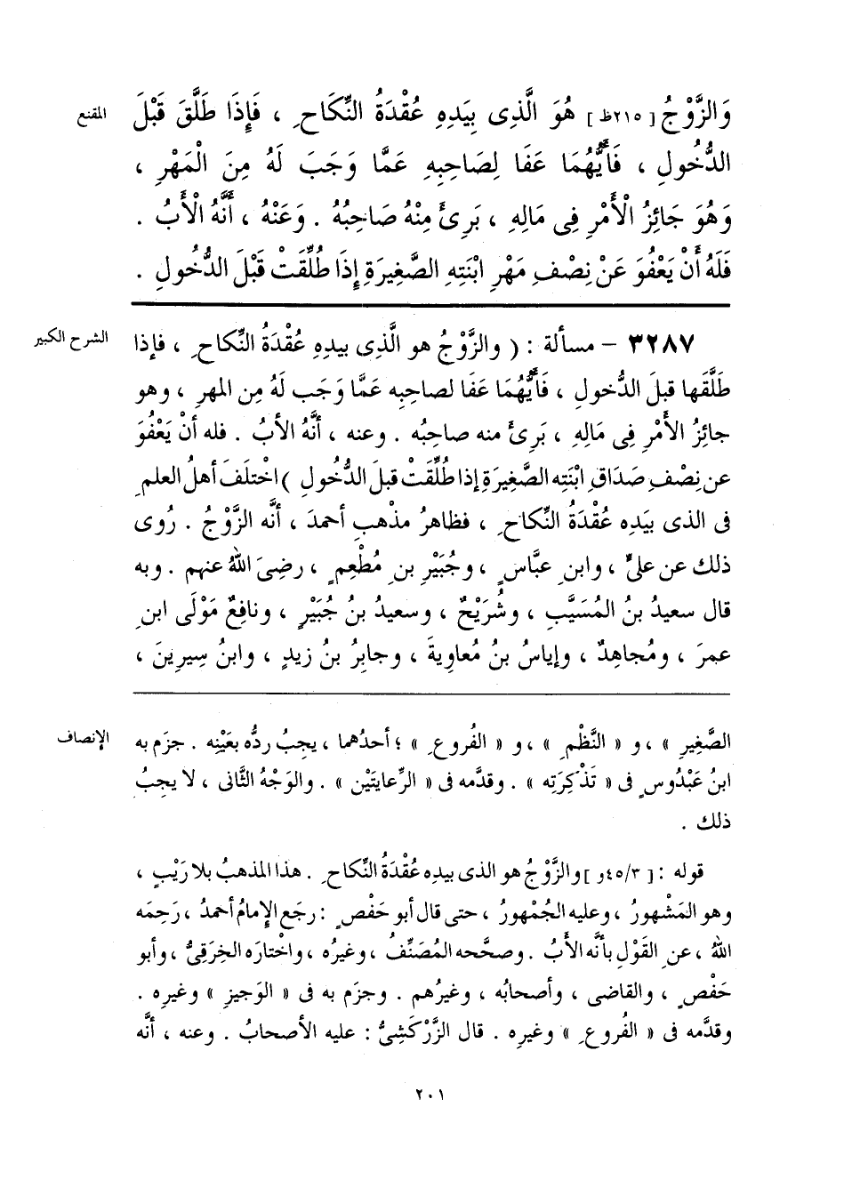 وَالزَّوْجُ هُوَ الَّذِى بِيَدِهِ عُقْدَةُ النِّكَاحِ، فَإِذَا طَلَّقَ قَبْلَ الدُّخُولِ، فَأَيُّهُمَا عَفَا لِصَاحِبِهِ عَمَّا وَجَبَ لَهُ مِنَ الْمَهْرِ، وَهُوَ جَائِزُ الأَمْرِ فِى مَالِهِ، بَرِئَ مِنْهُ صَاحِبُهُ. وَعَنْهُ، أَنَّهُ الْأَبُ. فَلَهُ أَنْ يَعْفُوَ عَنْ نِصْفِ مَهْرِ ابْنَتِهِ الصَّغِيرَةِ إِذَا طُلِّقَتْ قَبْلَ الدُّخولِ.