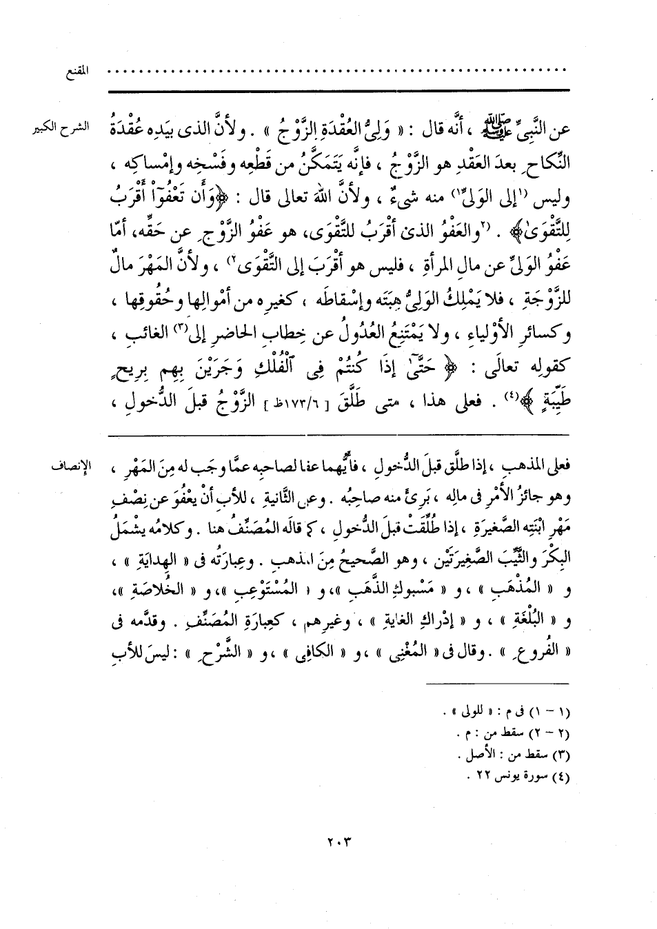 فعلى المذهب، إذا طلَّق قبلَ الدُّخولِ، فأَيُّهما عفا لصاحبِه عمَّا وجب له مِنَ المَهْرِ، وهو جائزُ الأَمْرِ فى مالِه، بَرِئَ منه صاحِبُه. وعن الثَّانيةِ، للأبِ أَنْ يعْفُوَ عن نِصْفِ مَهْرِ ابْنَتِه الصَّغيرَةِ، إذا طُلِّقَتْ قبلَ الدُّخولِ، كما قالَه المُصَنِّفُ هنا. وكلامُه يشْمَلُ البِكْرَ والثَّيِّبَ الصَّغِيرَتَيْن، وهو الصَّحيحُ مِنَ المذهبِ. وعِبارَتُه فى «الهِدايَةِ»، و «المُذْهَبِ»، و «مَسْبوكِ الذَّهَبِ»، و «المُسْتَوْعِبِ»، و «الخُلاصَةِ»، و «البُلْغَةِ»، و «إِدْراكِ الغايةِ»، وغيرِهم، كعِبارَةِ المُصَنِّفِ. وقدَّمه فى «الفُروعِ». وقال فى «المُغْنِى»، و «الكافِى»، و «الشَّرْحِ»: ليسَ للأبِ