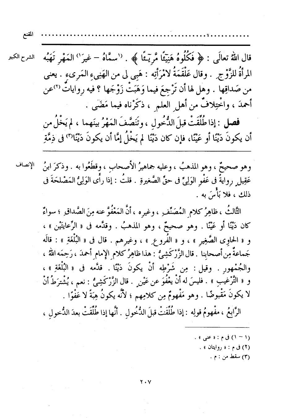الثَّالثُ، ظاهِرُ كلامِ المُصَنِّفِ، وغيرِه، أنَّ المَعْفُوَّ عنه مِنَ الصَّداقِ؛ سواءٌ كان دَيْنًا أو عَيْنًا. وهو صحيحٌ، وهو المذهبُ. وقدَّمه فى «الرِّعايتَيْن»، و «الحاوِى الصغِيرِ»، و «الفُروعِ»، وغيرِهم. قال فى «البُلْغَةِ»: قالَه جَماعة مِن أصحابِنا. قال الزَّركَشِىُّ: هذا ظاهِرُ كلامِ الإِمامِ أحمدَ، رَحِمَه اللَّهُ، والجُمْهورِ. وقيل: مِن شرطِه أَنْ يكونَ دَيْنًا. قدَّمه فى «البُلْغَةِ»، و «التَّرْغيبِ». فليسَ له أَنْ يعفُوَ عن عَيْنٍ. قالِ الزَّركَشِىُّ: نعم، يُشْترَطُ أَنْ لا يكونَ مَقْبوضًا. وهو مَفْهوم مِن كلامِهم؛ لأنَّه يكونُ هِبَةً لا عَفْوًا.