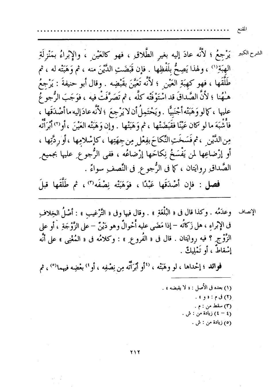 وعدَمُه. وكذا قال فى «البُلْغَةِ». وقال فيها وفى «التَّرْغيبِ»: أصْلُ الخِلافِ فى الإِبْراءِ، هل زَكاتُه -إذا مَضَى عليه أَحْوالٌ وهو دَيْنٌ- على الزَّوْجَةِ، أو على الزَّوْجِ؟ فيه رِوايَتان. قال فى «الفُروعِ»: وكلامُه فى «المُغْنِى» على أنَّه إسْقاطٌ، أو تَمْلِيكٌ.