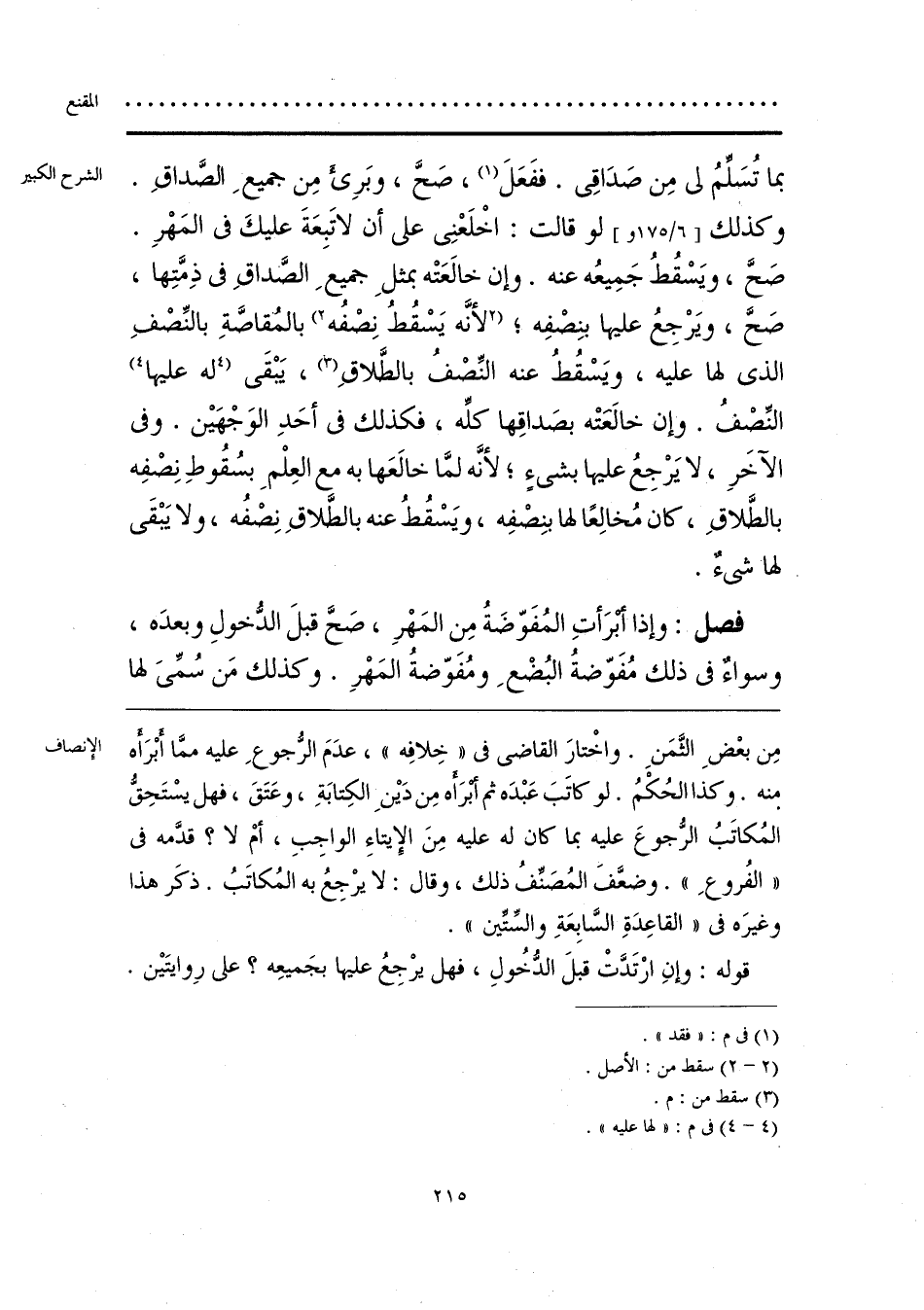 مِن بعضِ الثَّمَنِ. واخْتارَ القاضى فى «خِلافِه»، عدَمَ الرُّجوعِ عليه ممَّا أَبْرَأَه منه. وكذا الحُكْمُ. لو كاتَبَ عَبْدَه ثم أبْرَأَه مِن دَيْنِ الكِتابَةِ، وعَتَقَ، فهل يسْتَحِقُّ المُكاتَبُ الرُّجوعَ عليه بما كان له عليه مِنَ الإِيتاءِ الواجبِ، أمْ لا؟ قدَّمه فى «الفُروعِ». وضعَّفَ المُصَنِّفُ ذلك، وقال: لا يرْجِعُ به المُكاتَبُ. ذكَر هذا وغيرَه فى «القاعِدَةِ السَّابِعَةِ والسِّتِّين».