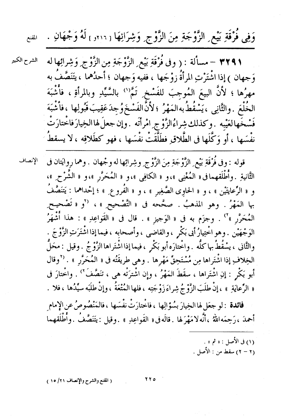 وَفِى فُرْقَةِ بَيْعِ الزَّوْجَةِ مِنَ الزَّوْجِ وَشِرَائِهَا لَهُ وَجْهَانِ.