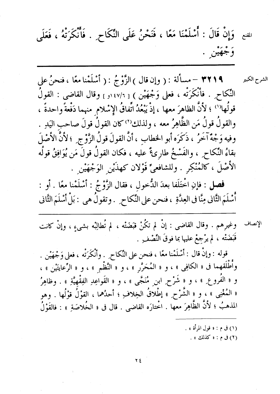 قوله: وإنْ قال: أسْلَمْنا معًا، فنحن على النِّكاحِ. وأنْكَرَتْه، فعلى وَجْهَين. وأَطْلَقهما في «الكافِي»، و «المُحَرَّرِ»، و «النَّظْمِ»، و «الرِّعايتَين»، و «الفُروعِ»، و «شَرْحِ ابنِ مُنَجَّى»، و «القَواعِدِ الفِقْهِيَّةِ». وظاهِرُ «المُغْنِي»، و «الشَّرْحِ» إطْلاقُ الخِلافِ؛ أحدُهما، القوْلُ قوْلُها. وهو المذهبُ؛ لأنَّ الظَّاهِرَ معها. اخْتارَه القاضي. قال في «الخُلاصَةِ»: فالقَوْلُ