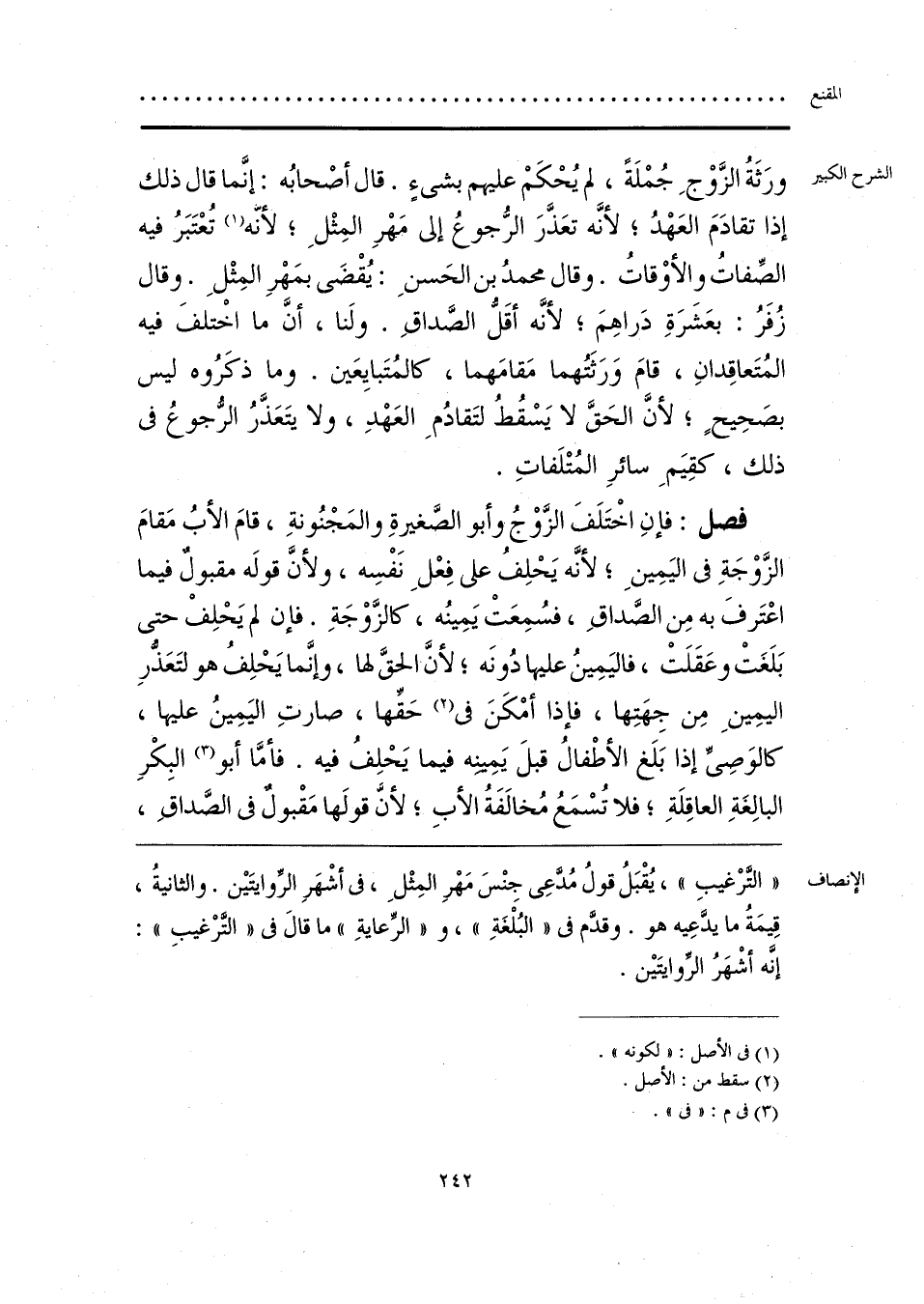 «التَّرْغيبِ»، يُقْبَلُ قولُ مُدَّعِى جِنْسَ مَهْرِ المِثْلِ، فى أشْهَرِ الرِّوايتَيْن. والثانيةُ، قِيمَةُ ما يدَّعِيه هو. وقدَّم فى «البُلْغَةِ»، و «الرِّعايَةِ» ما قالَ فى «التَّرْغيبِ»: إنَّه أشْهَرُ الرِّوايتَيْن.