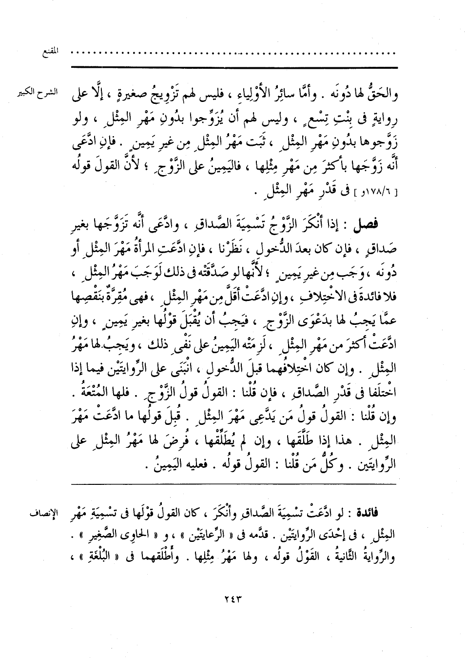 فائدة: لو ادَّعَتْ تسْمِيَةَ الصَّداقِ وأنْكَرَ، كان القولُ قوْلَها فى تسْمِيَةِ مَهْرِ المِثْلِ، فى إحْدَى الرِّوايتَيْن. قدَّمه فى «الرِّعايتَيْن»، و «الحاوِى الصَّغِيرِ». والرِّوايةُ الثَّانيةُ، القَوْلُ قولُه، ولها مَهْرُ مِثْلِها. وأَطْلَقهما فى «البُلْغَةِ»،