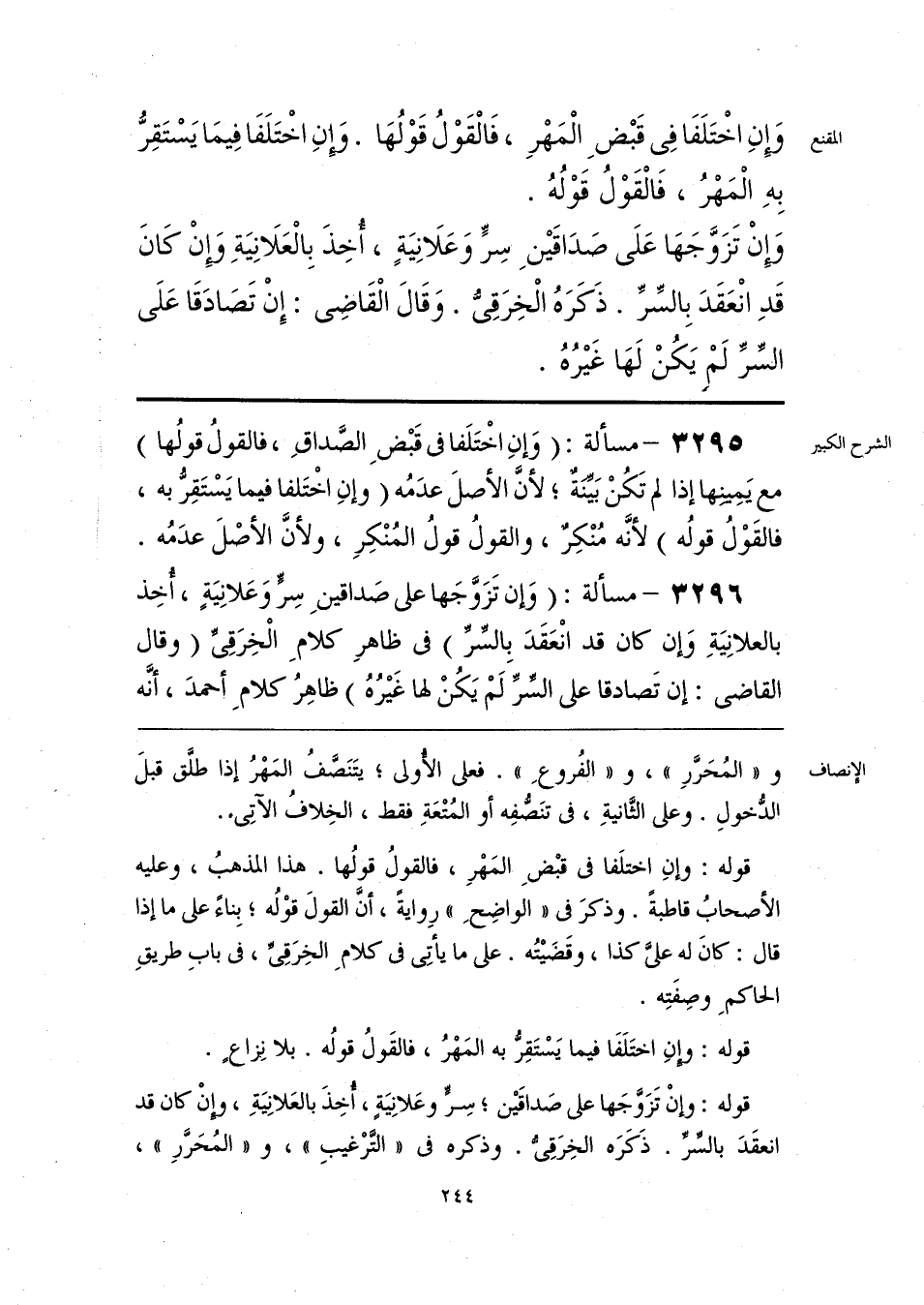 و «المُحَرَّرِ»، و «الفُروعِ». فعلى الأُولى، يتَنَصَّفُ المَهْرُ إذا طلَّق قبلَ الدُّخولِ. وعلى الثَّانيةِ، فى تنَصُّفِه أو المُتْعَةِ فقط، الخِلافُ الآتِى.