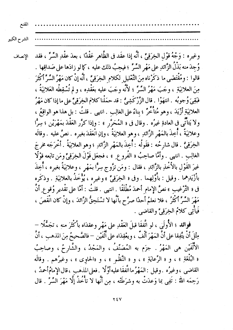 وغيرِه: وَجْهُ قوْلِ الخِرَقِىِّ، أنَّه إذا عقَد فى الظَّاهرِ عَقْدًا، بعدَ عقْدِ السِّرِّ، فقد وُجِدَ منه بَذْلُ الزَّائدِ على مَهْرِ السِّرِّ؛ فيجِبُ ذلك عليه، كما لو زادَها على صَداقِها. قالوا: ومُقْتَضَى ما ذكَرْناه مِنَ التَّعْليلِ لكلامِ الخِرَقِىِّ، أنَّه إنْ كانْ مَهْرُ السِّرِّ أكْثَرَ مِنَ العلانِيَةِ، وجَبَ مَهْرُ السِّرِّ؛ لأنَّه وجَبَ عليه بعَقْدِه، ولم تُسْقِطْه العَلانِيَةُ، فبَقِىَ وُجوبُه. انتهَوْا. قال الزَّرْكَشِىُّ: قد حمَلْنا كلامَ الخِرَقِىِّ على ما إذا كان مَهْرُ العلانِيَةِ أزْيَدَ، وهو مُتأَخِّرٌ؛ بِناءً على الغالِبِ. انتهى. قلتُ: بل هذا هو الواقِعُ، ولا يَتأتَّى فى العادةِ غيرُه. وقال فى «المُحَرَّرِ»: وإذا كرَّر العَقْدَ بمَهْرَيْن؛ سِرًّا وعلانِيَةً، أُخِذَ بالمَهْرِ الزَّائدِ، وهو العلانِيَةُ، وإنِ انْعَقَدَ بغيرِه. نصَّ عليه. وقالَه الخِرَقِىُّ. قال شارِحُه: فقَولُه: أُخِذَ بالمَهْرِ الزَّائدِ؛ وهو العلانِيَةُ. أخْرَجَه مخرجَ الغالِبِ. انتهى. وأمَّا صاحِبُ «الفُروعِ»، فجعَل قَوْلَ الخِرَقِىِّ ومَن تابَعه قوْلًا غيرَ القَوْلِ بالأخْذِ بالزَّائدِ، فقال: ومَن تزَّوج سِرًّا بمَهْرٍ، وعلانِيَةً بغيرِه، أُخِذَ بأزْيَدِهما. وقيل: بأَوَّلِهما. وفى «الخِرَقِىِّ» وغيرِه، يُؤْخَذُ بالعلانِيَةِ. وذكَره فى «التَّرْغيبِ» نصَّ الإمام أحمدَ مُطْلَقًا. انتهى. قلتُ: أمَّا على تقْديرِ وُقوعِ أنَّ مَهْرَ السِّرِّ أكْثَرُ، فلا نعلمُ أحَدًا صرَّح بأنَّها لا تسْتَحِقُّ الزَّائدَ، وإنْ كان انْقَصَ، فَيأْتِى كلامُ الخِرَقِىِّ والقاضى.