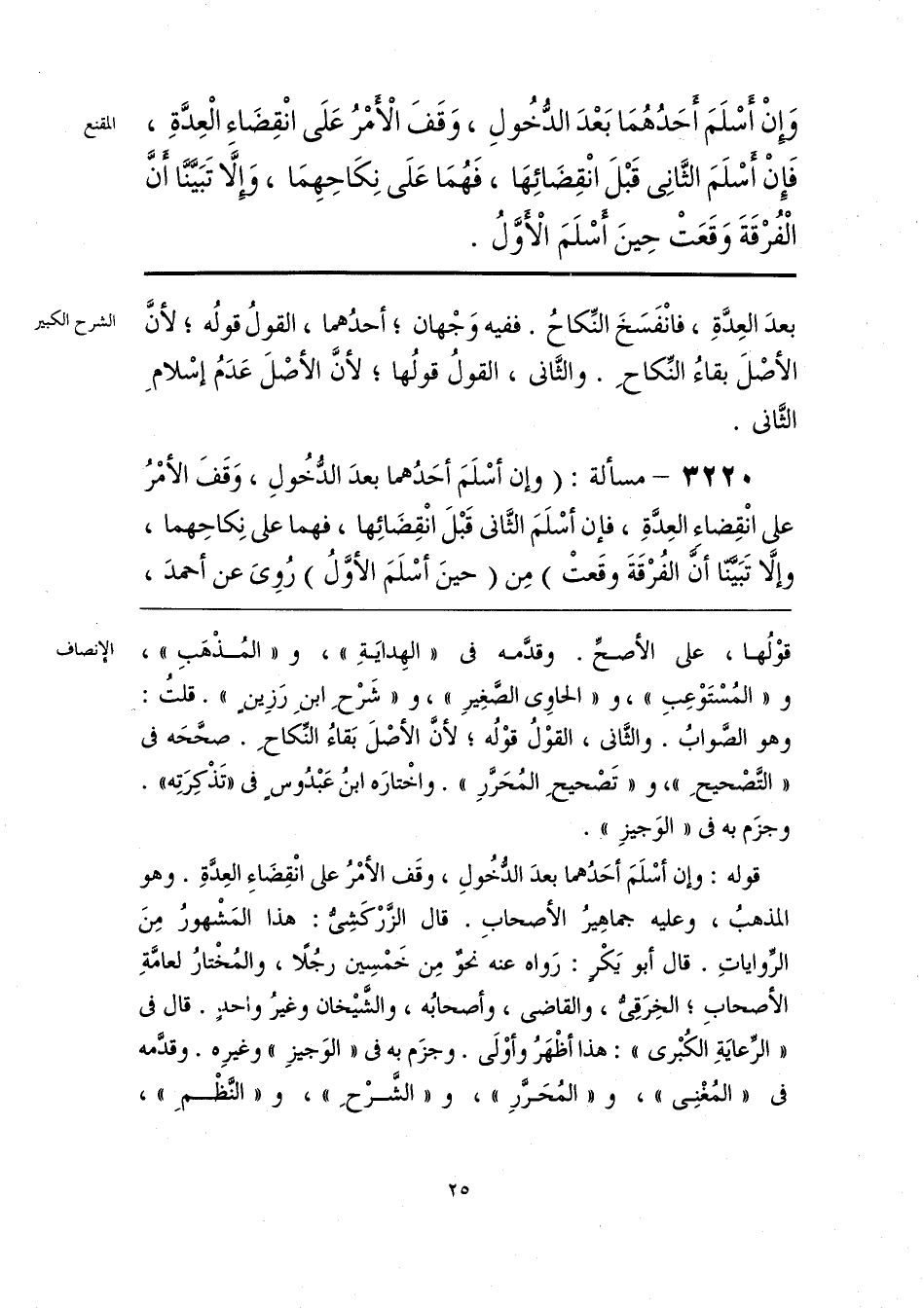 قوله: وإن أسْلَمَ أحَدُهما بعدَ الدُّخُولِ، وقَف الأمْرُ على انْقِضَاءِ العِدَّةِ. وهو المذهبُ، وعليه جماهِيرُ الأصحابِ. قال الزَّرْكَشِيُّ: هذا المَشْهورُ مِنَ الرِّواياتِ. قال أبو بَكْرٍ: رَواه عنه نحوٌ مِن خَمْسِين رجُلًا، والمُخْتارُ لعامَّةِ الأصحابِ؛ الخِرَقِيُّ، والقاضي، وأصحابُه، والشَّيخان وغيرُ واحدٍ. قال في «الرِّعايَةِ الكُبْرى»: هذا أظْهَرُ وأوْلَى. وجزَم به في «الوَجيزِ» وغيرِه. وقدَّمه في «المُغْنِي»، و «المُحَرَّرِ»، و «الشَّرْحِ»، و «النَّظْمِ»،