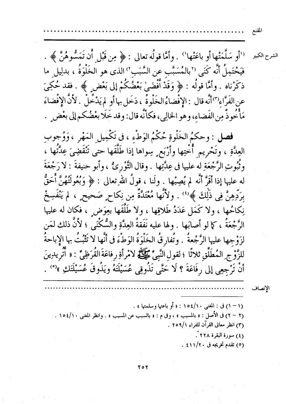 فصل: وحكمُ الخَلْوةِ حُكْمُ الوَطْءِ، في تَكْمِيلِ المَهْرِ، وَوُجوبِ العِدَّةِ، وتَحْرِيمِ أُخْتِها وأرْبَعٍ سِواها إذا طَلَّقَها حتى تَنْقَضِىَ عِدَّتُها، وثُبُوتِ الرَّجْعَةِ له عليها في عِدَّتِها. وقال الثَّوْرِىُّ، وأبو حنيفةَ: لا رَجْعَةَ له عليها إذا أقَرَّ أنَّه لم يُصِبْها. ولَنا، قولُ اللَّهِ تعالى: {وَبُعُولَتُهُنَّ أَحَقُّ بِرَدِّهِنَّ فِي ذَلِكَ} (¬4). ولأنَّها مُعْتَدَّةٌ مِن نِكاحٍ صَحيحٍ، لم يَنْفَسِخْ نِكاحُها، ولا كَمَل عَدَدُ طَلاقِها، ولا طَلَّقَها بعِوَضٍ، فكان له عليها الرَّجْعَةُ، كما لو أصابَها. ولها عليه نَفَقةُ العِدَّةِ والسُّكْنَى؛ لأَنَّ ذلك لمَن لزَوْجِها عليها الرَّجْعةُ. وتُفارِقُ الخَلْوَةُ الوَطْءَ في أنَّها لا تَثْبُتُ بها الإِباحةُ للزَّوْجِ المُطَلِّقِ ثلاثًا؛ لقولِ النَّبِىِّ -صلى اللَّه عليه وسلم- لامْرأةِ رِفاعَةَ القُرَظِىِّ: «أَتُرِيدِينَ أَنْ تَرْجِعِى إلى رِفَاعَةَ؟ لَا حَتَّى تَذُوقِى عُسَيْلَتَهُ ويَذُوقَ عُسَيْلَتَكِ» (¬5).