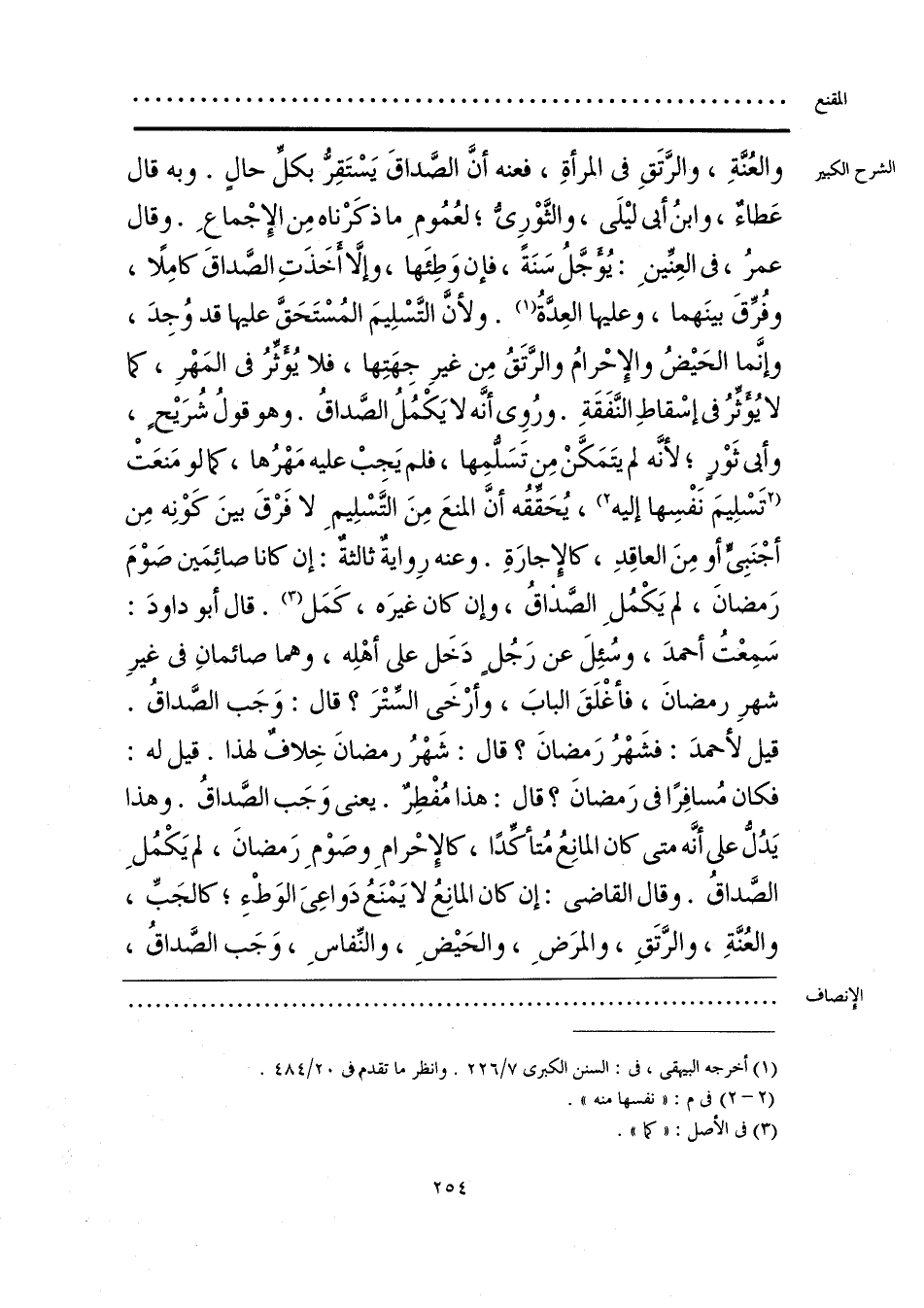 عمرُ، في العِنِّينِ: يُؤَجَّلُ سَنَةً، فإن وَطِئَها، وإلَّا أَخذَتِ الصَّداقَ كامِلًا، وفُرِّقَ بينَهما، وعليها العِدَّةُ (¬1). ولأَنَّ التَّسْلِيمَ المُسْتَحَقّ عليها قد وُجِدَ، وإنَّما الحَيْضُ والإِحْرامُ والرَّتَقُ مِن غيرِ جِهَتِها، فلا يُؤَثِّرُ في المَهْرِ، كما لا يُؤثِّرُ في إسْقاطِ النَّفَقَةِ. ورُوِى أنَّه لا يَكْمُلُ الصَّداقُ. وهو قولُ شرَيْحٍ، وأبى ثَوْرٍ؛ لأنَّه لم يتَمَكَّنْ مِن تَسَلُّمِها، فلم يَجبْ عليه مَهْرُها، كما لو مَنعَتْ [تَسْلِيمَ نَفْسِها إليه] (¬2)، يُحَقِّقُه أنَّ المنعَ مِنَ التًّسْلِيمِ لا فَرْقَ بينَ كَوْنِه مِن أجْنَبِىٍّ أو مِنَ العاقِدِ، كالإِجارَةِ. وعنه رِوايةٌ ثالثةٌ: إن كانا صائِمَين صَوْمَ رَمضانَ، لم يَكْمُلِ الصَّداقُ، وإن كان غيرَه، كَمَل (¬3). قال أبو داودَ: سَمِعْتُ أحمدَ، وسُئِلَ عن رَجُلٍ دَخَل على أهْلِه، وهما صائمانِ في غيرِ شهرِ رمضانَ، فأغْلَقَ البابَ، وأرْخَى السِّتْرَ؟ قال: وَجَب الصَّداقُ. قيل لأحمدَ: فشَهْرُ رَمضانَ؟ قال: شَهْرُ رمضانَ خِلافٌ لهذا. قيل له: فكان مُسافِرًا في رَمضانَ؟ قال: هذا مُفْطِرٌ. يعنى وَجَب الصَّداقُ. وهذا يَدُلُّ على أنَّه متى كان المانِعُ مُتأكِّدًا، كالإِحْرامِ وصَوْمِ رَمضانَ، لم يَكْمُلِ الصَّداقُ. وقال القاضى: إن كان المانِعُ لا يَمْنَعُ دَواعِىَ الوَطْءِ؛ كالجَبِّ، والعُنَّةِ، والرَّتَقِ، والمرَضِ، والحَيْضِ، والنِّفاسِ، وَجَب الصَّداقُ،