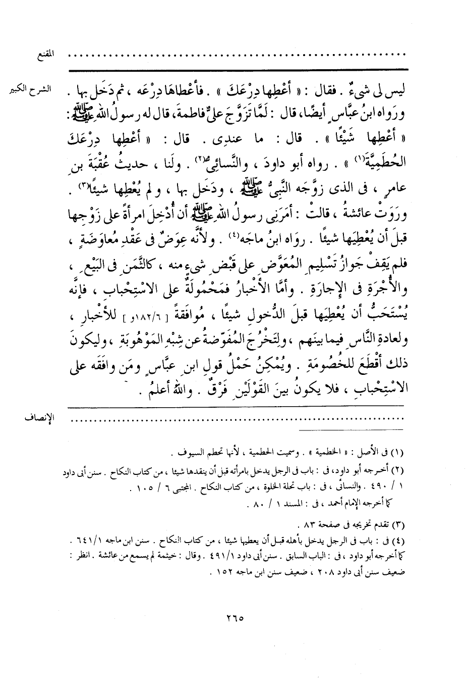 (¬2) أخرجه أبو داود، في: باب في الرجل يدخل بامرأته قبل أن ينقدها شيئا، من كتاب النكاح. سنن أبى داود 1/ 490. والنسائى، في: باب تحلة الخلوة، من كتاب النكاح. المجتبى 6/ 105.