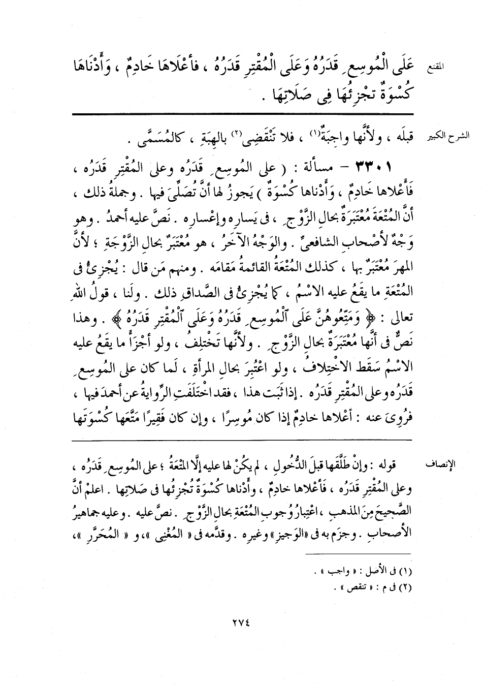 قوله: وإنْ طَلَّقَها قبلَ الدُّخُولِ، لم يكُنْ لها عليه إلَّا المتْعَةُ، على المُوسِعِ قَدَرُه، وعلى المُقْتِرِ قَدَرُه، فَأعْلاها خادِمٌ، وأدناها كُسْوَة تُجْزِئُها فى صَلاِتها. اعلمْ أنَّ الصَّحيحَ مِنَ المذهبِ، اعْتِبارُ وُجوبِ المُتْعَةِ بحالِ الزَّوْجِ. نصَّ عليه. وعليه جماهيرُ الأصحابِ. وجزَم به فى «الوَجيزِ» وغيرِه. وقدَّمه فى «المُغْنِى»، و «المُحَرَّرِ»،