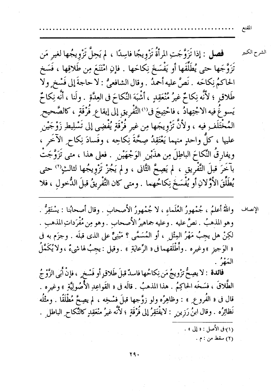 فائدة: لا يصِحُّ تزْويجُ مَن نِكاحُها فاسد قبلَ طَلاقٍ أو فَسْخٍ، فإنْ أبَى الزَّوْجُ الطَّلاقَ، فسَخَه الحاكِمُ. هذا المذهبُ. قالَه فى «القَواعِدِ الأُصُولِيَّةِ» وغيرِه. قال فى «الفُروعِ»: وظاهِرُه ولو زوَّجها قبلَ فسْخِه، لم يصِحَّ مُطْلَقًا. ومثْلُه نَظائِرُه. وقال ابنُ رَزِينٍ: لا يفْتَقِرُ إلى فُرْقَةٍ؛ لأنَّه غيرُ منْعَقِدٍ كالنِّكاحِ الباطلِ.
