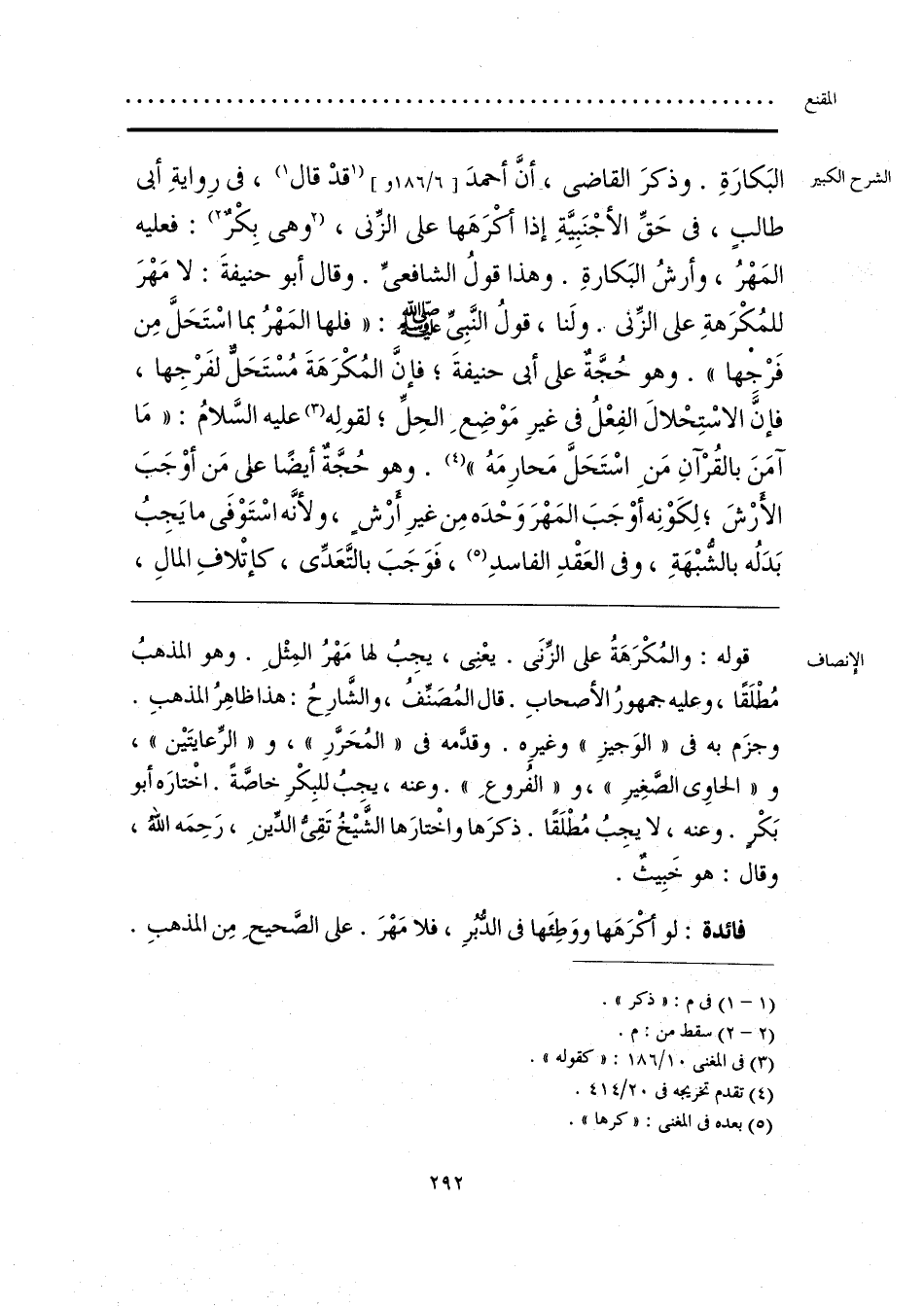 قوله: والمُكْرَهَةُ على الزِّنَى. يعْنِى، يجِبُ لها مَهْرُ المِثْلِ. وهو المذهبُ مُطْلَقًا، وعليه جمهورُ الأصحابِ. قال المُصَنِّفُ، والشَّارِحُ: هذا ظاهِرُ المذهبِ. وجزَم به فى «الوَجيزِ» وغيرِه. وقدُّمه فى «المُحَرَّرِ»، و «الرِّعايتَيْن»، و «الحاوِى الصَّغِيرِ»، و «الفُروعِ». وعنه، يجبُ للبِكْرِ خاصَّةً. اخْتارَه أبو بَكْرٍ. وعنه، لا يجِبُ مُطْلَقًا. ذكرَها واخْتارَها الشَّيْخُ تَقِىُّ الدِّينِ، رَحِمَه اللَّهُ، وقال: هو خَبِيثٌ.