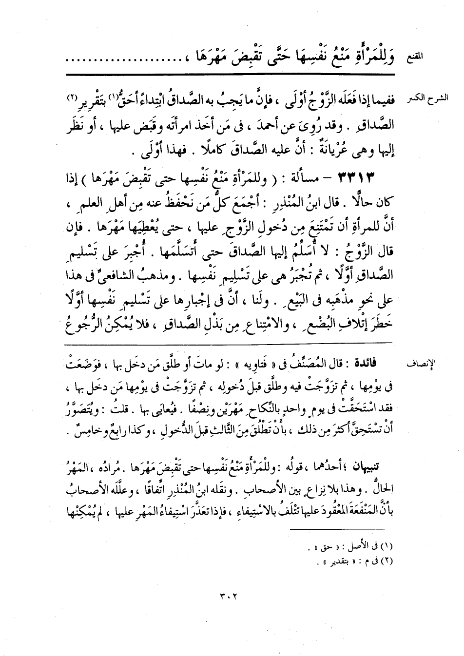 تنبيهان؛ أحدُهما، قولُه: وللْمَرأةِ مَنْعُ نَفْسِها حتى تَقْبِضَ مَهْرَها. مُرادُه، المَهْرُ الحالُّ. وهذا بلا نِزاعٍ بين الأصحابِ. ونقَله ابنُ المُنْذِرِ اتِّفاقًا، وعلَّلَه الأصحابُ بأنَّ المَنْفَعَةَ المعْقُودَ عليها تتْلَفُ بالاسْتِيفاءِ، فإذا تعَذَّرَ اسْتِيفاءُ المَهْرِ عليها، لم يُمْكِنْها