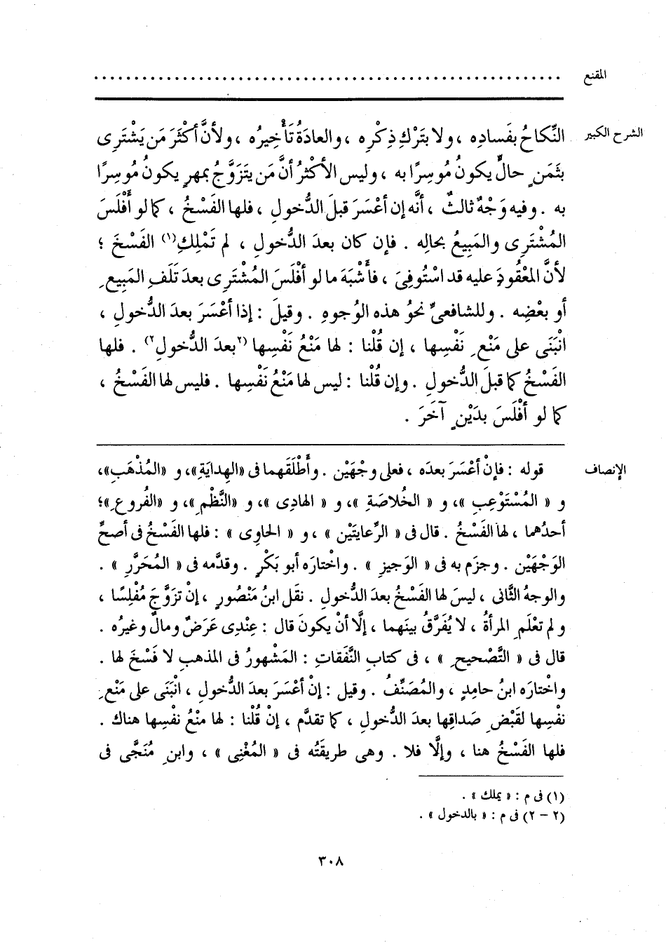 قوله: فإنْ أعْسَرَ بعدَه، فعلى وجْهَيْن. وأطْلَقَهما فى «الهِدايَةِ»، و «المُذْهَبِ»، و «المُسْتَوْعِبِ»، و «الخُلاصَةِ»، و «الهادِى»، و «النَّظْمِ»، و «الفُروعِ»؛ أحدُهما، لها الفَسْخُ. قال فى «الرِّعايَتَيْن»، و «الحاوِى»: فلها الفَسْخُ فى أصحِّ الوَجْهَيْن. وجزَم به فى «الوَجيزِ». واخْتارَه أبو بَكْرٍ. وقدَّمه فى «المُحَرَّرِ». والوجهُ الثَّانى، ليسَ لها الفَسْخُ بعدَ الدُّخولِ. نقَل ابنُ مَنْصُورٍ، إنْ تزَوَّج مُفْلِسًا، ولم تعْلَمِ المرأةُ، لا يُفَرّقُ بينَهما، إلَّا أَنْ يكونَ قال: عِنْدِى عَرَضٌ ومالٌ وغيرُه. قال فى «التَّصْحيحِ»، فى كتابِ النَّفَقاتِ: المَشْهورُ فى المذهبِ لا فَسْخَ لها. واخْتارَه ابنُ حامِدٍ، والمُصَنِّفُ. وقيل: إنْ أعْسَرَ بعدَ الدُّخولِ، انْبَنَى على مَنْعِ نفْسِها لقَبْضِ صَداقِها بعدَ الدُّخولِ، كما تقدَّم، إنْ قُلْنا: لها منْعُ نفْسِها هناك. فلها الفَسْخُ هنا، وإلَّا فلا. وهى طريقَتُه فى «المُغْنِى»، وابنِ مُنَجَّى فى