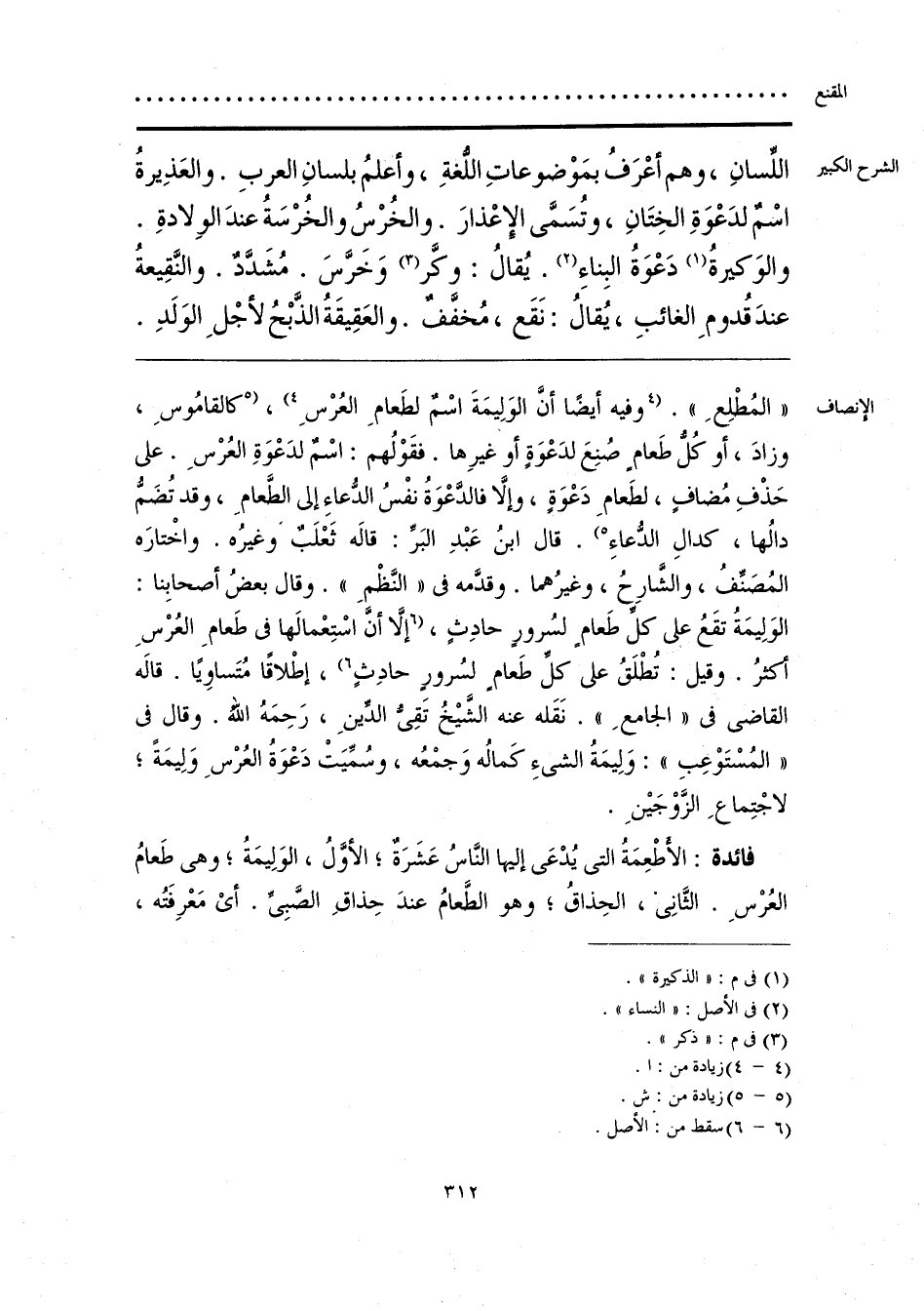 «المُطْلِعِ». [وفيه أيضًا أنَّ الوَلِيمَةَ اسْمٌ لطَعامِ العُرْسِ] (¬1)، [كالقامُوسِ، وزادَ، أو كُلُّ طَعامٍ صُنِعَ لدَعْوَةٍ أو غيرِها. فقَوْلُهم: اسْمٌ لدَعْوَةِ العُرْسِ. على حَذْفِ مُضافٍ، لطَعام دَعْوَةٍ، وإلَّا فالدَّعْوَةُ نفْسُ الدُّعاءِ إلى الطَّعامِ، وقد تُضَمُّ دالُها، كدالِ الدُّعاءِ] (¬2). قال ابنُ عَبْدِ البَرِّ: قالَه ثَعْلَبٌ وغيرُه. واخْتارَه المُصَنِّفُ، والشَّارِحُ، وغيرُهما. وقدَّمه فى «النَّظْمِ». وقال بعضُ أصحابِنا: الوَلِيمَةُ تقَعُ على كل طَعامٍ لسُرورٍ حادِثٍ، [إلَّا أنَّ اسْتِعْمالَها فى طَعامِ العُرْسِ أكثرُ. وقيل: تُطْلَقُ على كلِّ طَعامٍ لسُرورٍ حادِثٍ] (¬3)، إطْلاقًا مُتَساوِيًا. قالَه القاضى فى «الجامعِ». نَقَله عنه الشَّيْخُ تَقِىُّ الدِّينِ، رَحِمَهُ اللَّهُ. وقال فى «المُسْتَوْعِبِ»: وَلِيمَةُ الشئِ كَمالُه وَجمْعُه، وسُمِّيَتْ دَعْوَةُ العُرْسِ وَلِيمَةً؛ لاجْتِماعَ الزَّوْجَيْنِ.