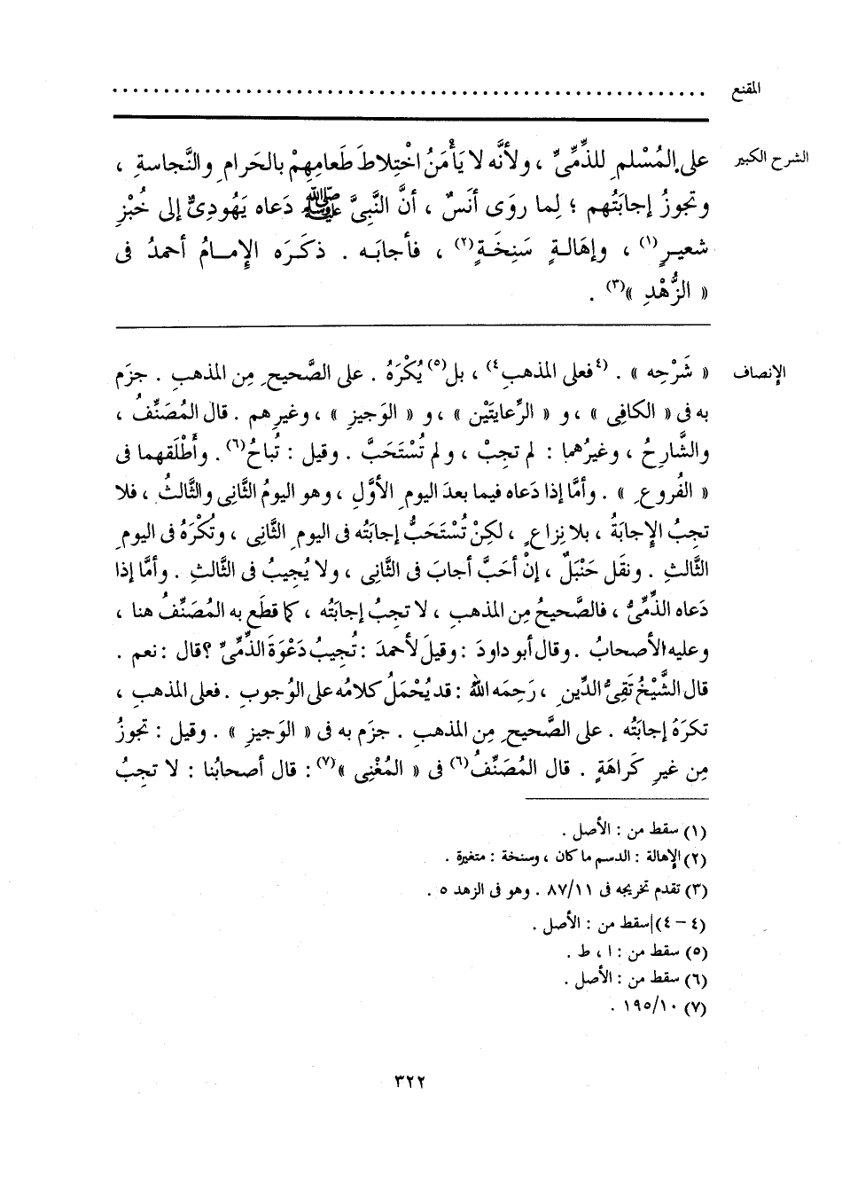 «شَرْحِه». [فعلى المذهبِ] (¬1)، بل (¬2) يُكْرَهُ. على الصَّحيحِ مِن المذهبِ. جزَم به فى «الكافِى»، و «الرِّعايتَيْن»، و «الوَجيزِ»، وغيرِهم. قال المُصَنِّفُ، والشَّارِحُ، وغيرُهما: لم تجِبْ، ولم تُسْتَحَبَّ. وقيل: تُباحُ (¬3). وأَطْلَقهما فى «الفُروعِ». وأمَّا إذا دَعاه فيما بعدَ اليومِ الأَوَّلِ، وهو اليومُ الثَّانِى والثَّالثُ، فلا تجِبُ الإِجابَةُ، بلا نِزاعٍ، لكِنْ تُسْتَحَبُّ إجابَتُه فى اليومِ الثَّانِى، وتُكْرَهُ فى اليومِ الثَّالثِ. ونقَل حَنْبَلٌ، إنْ أحَبَّ أجابَ فى الثَّانِى، ولا يُجِيبُ فى الثَّالثِ. وأمَّا إذا دَعاه الذِّمِّىُّ، فالصَّحيحُ مِن المذهبِ، لا تجِبُ إجابَتُه، كما قطَع به المُصَنِّفُ هنا، وعليه الأصحابُ. وقال أبو داودَ: وقيلَ لأحمدَ: تُجِيبُ دَعْوَةَ الذِّمِّىِّ؟ قال: نعم. قال الشَّيْخُ تَقِىُّ الدِّينِ، رَحِمَه اللَّهُ: قد يُحْمَلُ كلامُه على الوُجوبِ. فعلى المذهبِ، تكرَه إجابَتُه. على الصَّحيحِ مِن المذهبِ. جزَم به فى «الوَجيزِ». وقيل: تجوزُ مِن غيرِ كَراهَةٍ. قال المُصَنِّفُ (6) فى «المُغْنِى» (¬4): قال أصحابُنا: لا تجِبُ