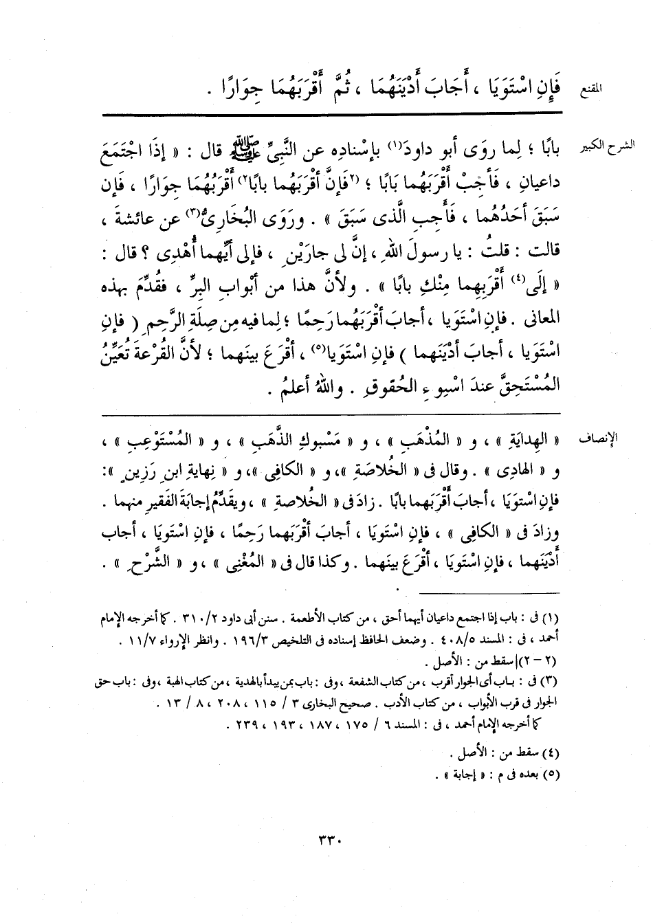 «الهِدايَةِ»، و «المُذْهَبِ»، و «مَسْبوكِ الذَّهَبِ»، و «المُسْتَوْعِبِ»، و «الهادِى». وقال فى «الخُلاصَةِ»، و «الكافِى»، و «نِهايةِ ابنِ رَزِينٍ»: فإنِ اسْتوَيَا، أجابَ أقْرَبَهما بابًا. زادَ فى «الخُلاصةِ»، ويقَدِّمُ إجابَةَ الفَقيرِ منهما. وزادَ فى «الكافِى»، فإنِ اسْتَويَا، أجابَ أقْرَبَهما رَحِمًا، فإنِ اسْتَويَا، أجاب أدينَهما، فإنِ اسْتَويَا، أقْرَعَ بينَهما. وكذا قال فى «المُغْنِى»، و «الشَّرْحِ».
