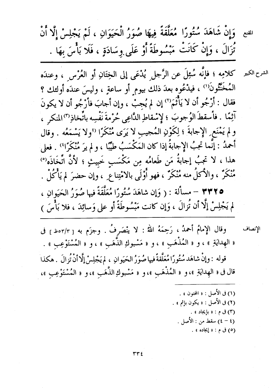 وإنْ شَاهَدَ سُتُورًا مُعَلَّقَةً فِيها صُوَرُ الْحَيَوَانِ، لم يَجْلِسْ إِلّا أَنْ تُزَالَ، وَإِنْ كَانَتْ مَبْسُوطَةً أو عَلَى وِسَادَةٍ، فَلَا بَأْسَ بِهَا.
