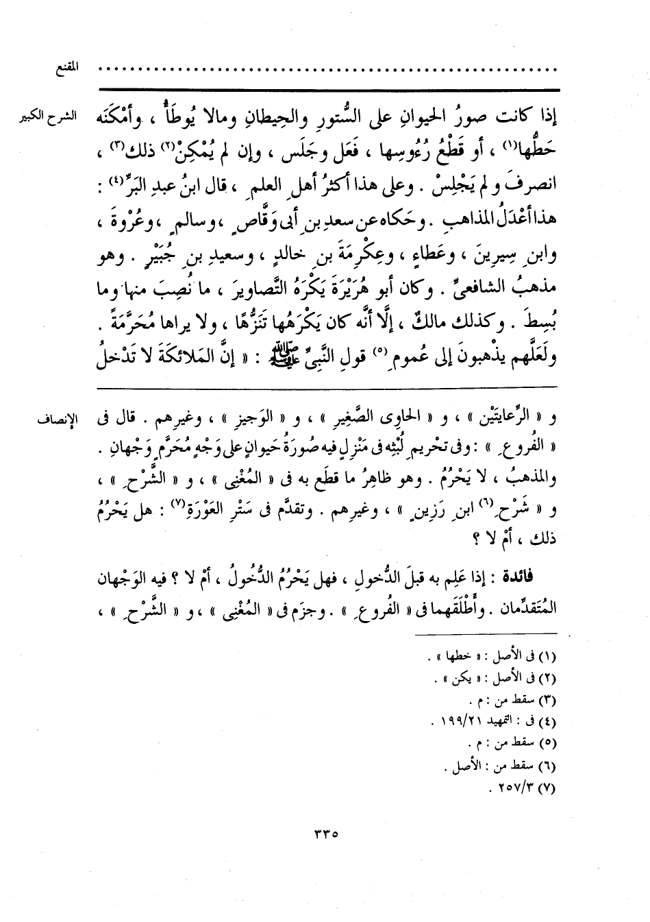 و «الرِّعايتَيْن»، و «الحاوِى الصَّغِيرِ»، و «الوَجيزِ»، وغيرِهم. قال فى «الفُروعِ»: وفى تحْريمِ لُبْثِه فى مَنْزِلٍ فيه صُورَةُ حَيوانٍ على وَجْهٍ مُحَرَّم وَجْهانِ. والمذهبُ، لا يَحْرُمُ. وهو ظاهِرُ ما قطَع به فى «المُغْنِى»، و «الشَّرْحِ»، و «شَرْحِ (¬1) ابنِ رَزِينٍ»، وغيرِهم. وتقدَّم فى سَتْرِ العَوْرَةِ (¬2): هل يَحْرُمُ ذلك، أمْ لا؟