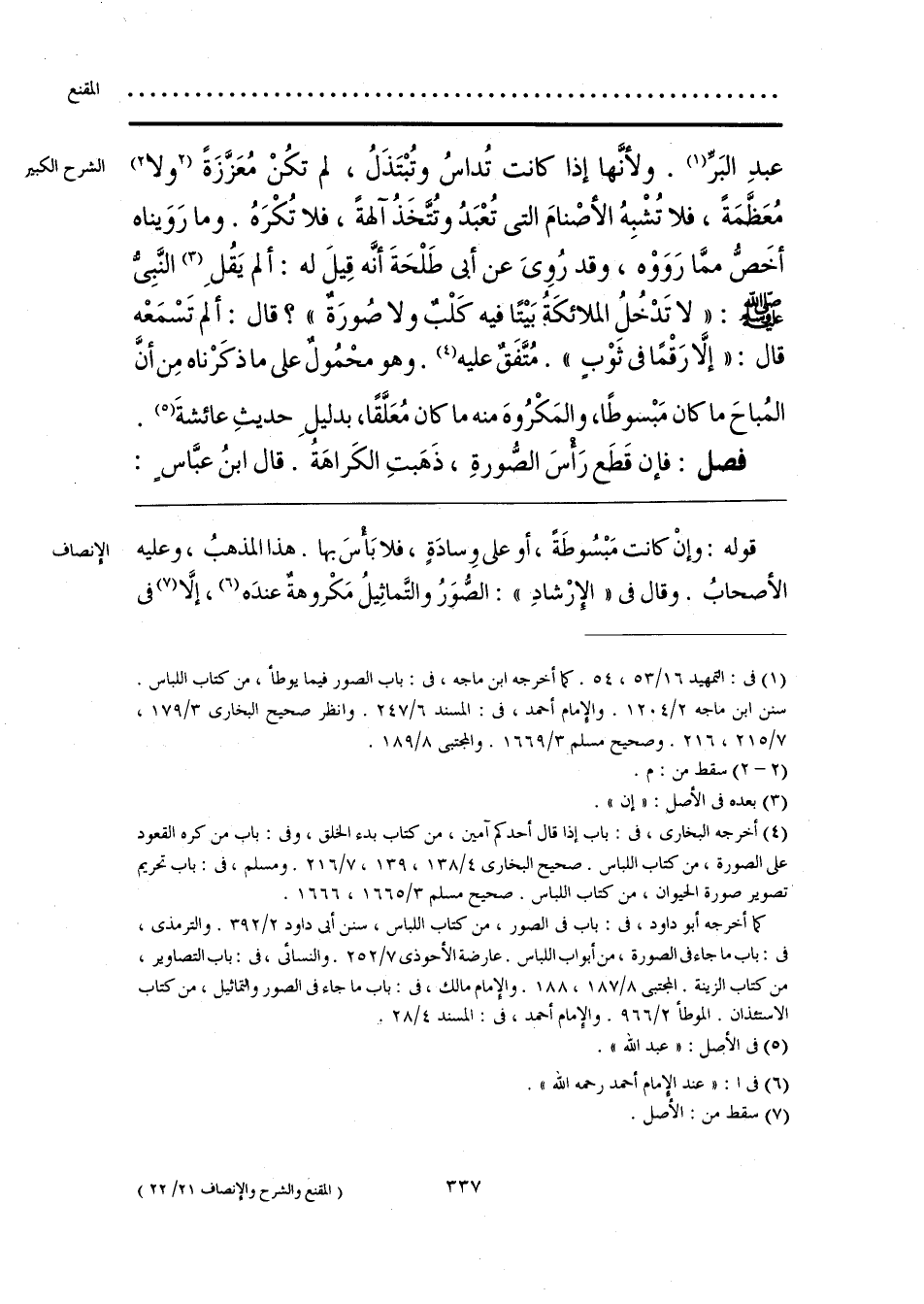 قوله: وإنْ كانت مَبْسُوطَةً، أو على وِسادَةٍ، فلا بَأْسَ بها. هذا المذهبُ، وعليه الأصحابُ. وقال فى «الإِرْشادِ»: الصُّوَرُ والتَّماثِيلُ مَكْروهةٌ عندَه (¬1)، إلَّا (¬2) فى