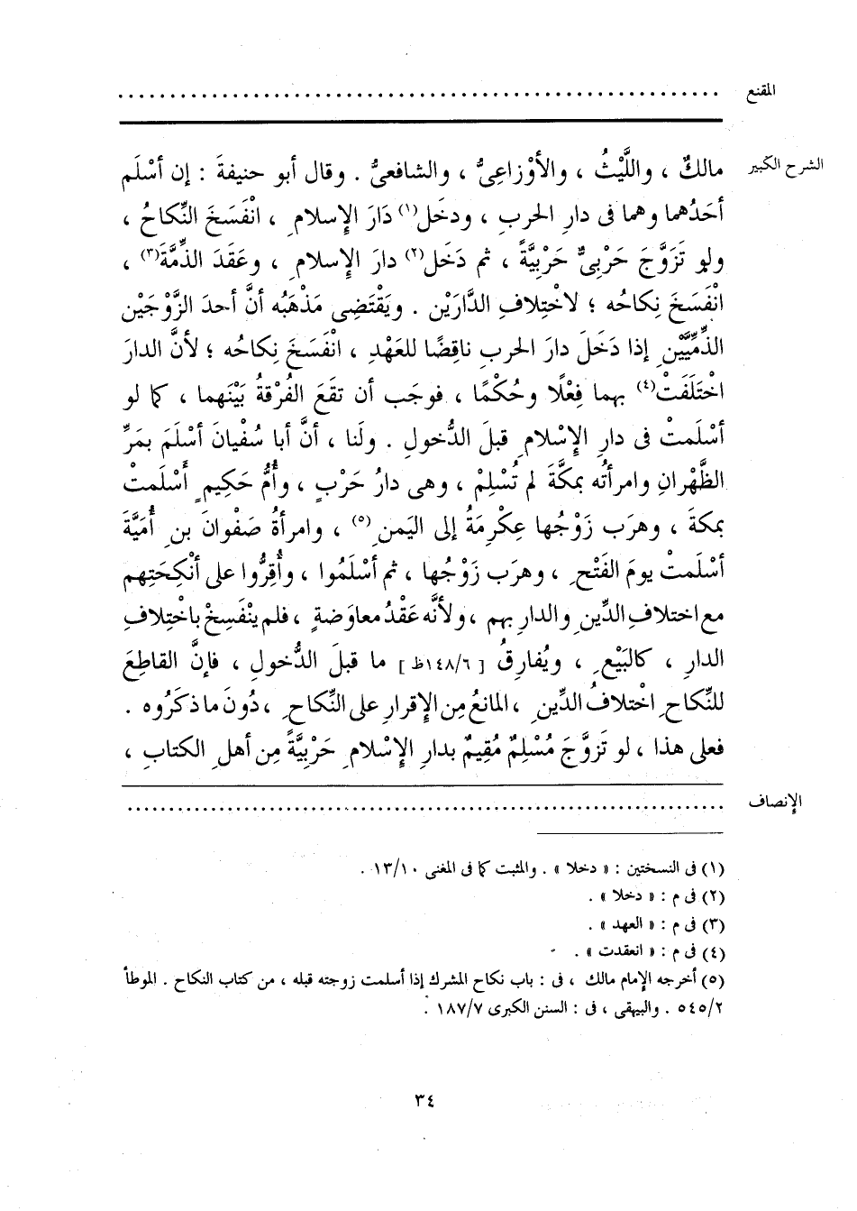 مالكٌ، واللَّيثُ، والأوْزاعِيُّ، والشافعيُّ. وقال أبو حنيفةَ: إن أسْلَم أحَدُهما وهما في دارِ الحربِ، ودخَل (¬1) دَارَ الإِسلامِ، انْفَسَخَ النِّكاحُ، ولو تَزَوَّجَ حَرْبِيٌّ حَرْبِيَّةً، ثم دَخَل (¬2) دارَ الإِسلام، وعَقَدَ الذِّمَّةَ (¬3)، انفَسَخَ نِكاحُهُ؛ لاخْتِلافِ الدَّارَين. ويَقْتَضِي مَذْهَبُه أنَّ أحدَ الزَّوْجَين الذِّمِّيَّينِ إذا دَخَلَ دارَ الحربِ ناقِضًا للعَهْدِ، انْفَسَخَ نِكاحُه؛ لأنَّ الدارَ اخْتَلَفَتْ (¬4) بهما فِعْلًا وحُكْمًا، فوجَب أن تقَعَ الفُرْقةُ بَينَهما، كما لو أسْلَمتْ في دارِ الإِسْلامِ قبلَ الدُّخولِ. ولَنا، أنَّ أبا سُفْيانَ أسْلَمَ بمَرِّ الظَّهْرانِ وامرأتُه بمكَّةَ لم تُسْلِمْ، وهي دارُ حَرْبٍ، وأُمُّ حَكِيمٍ أَسْلَمتْ بمكةَ، وهرَب زَوْجُها عِكْرِمَةُ إلى اليَمنِ (¬5)، وامرأةُ صَفْوانَ بنِ أُمَيَّةَ أسْلَمتْ يومَ الفَتْحِ، وهرَب زَوْجُها، ثم أسْلَمُوا، وأُقِرُّوا على أنْكِحَتِهم مع اختلافِ الدِّينِ والدارِ بهم، ولأنَّه عَقْدُ معاوَضةٍ، فلم ينْفَسِخْ باخْتِلافِ الدارِ، كالبَيعِ، ويُفارِقُ ما قبلَ الدُّخولِ، فإنَّ القاطِعَ للنِّكاحِ اخْتلافُ الدِّينِ، المانعُ مِن الإِقرارِ على النِّكاحِ، دُونَ ما ذكَرُوه. فعلى هذا، لو تَزوَّجَ مُسْلِمٌ مُقِيمٌ بدارِ الإِسْلامِ حَرْبِيَّةً مِن أهلِ الكتابِ،