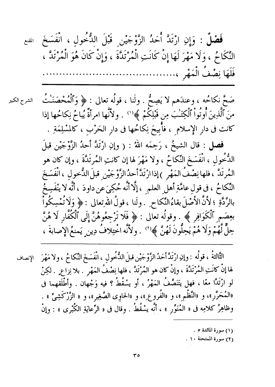 الثَّالثةُ، قولُه: وإنِ ارْتَدَّ أحَدُ الزَّوْجَين قبلَ الدُّخُولِ، انْفَسَخَ النِّكاحُ، ولا مَهْرَ لها إنْ كانَتِ المُرْتَدَّةَ، وإنْ كان هو المُرْتَدَّ، فلها نِصْفُ المَهْرِ. بلا نِزاعٍ. لكِنْ لو ارْتَدَّا معًا، فهل يتَنَصَّفُ المَهْرُ، أو يسْقُطُ؟ فيه وَجْهان. وأطْلَقهما في «المُحَرَّرِ»، و «النَّظْمِ»، و «الفُروعِ»، و «الحاوي الصَّغِيرِ»، و «الزَّرْكَشِيِّ». وظاهِرُ كلامِه في «المُنَوِّرِ»، أنَّه يسْقُطُ. وقال في «الرِّعايَةِ الكُبْرى»: وإنْ