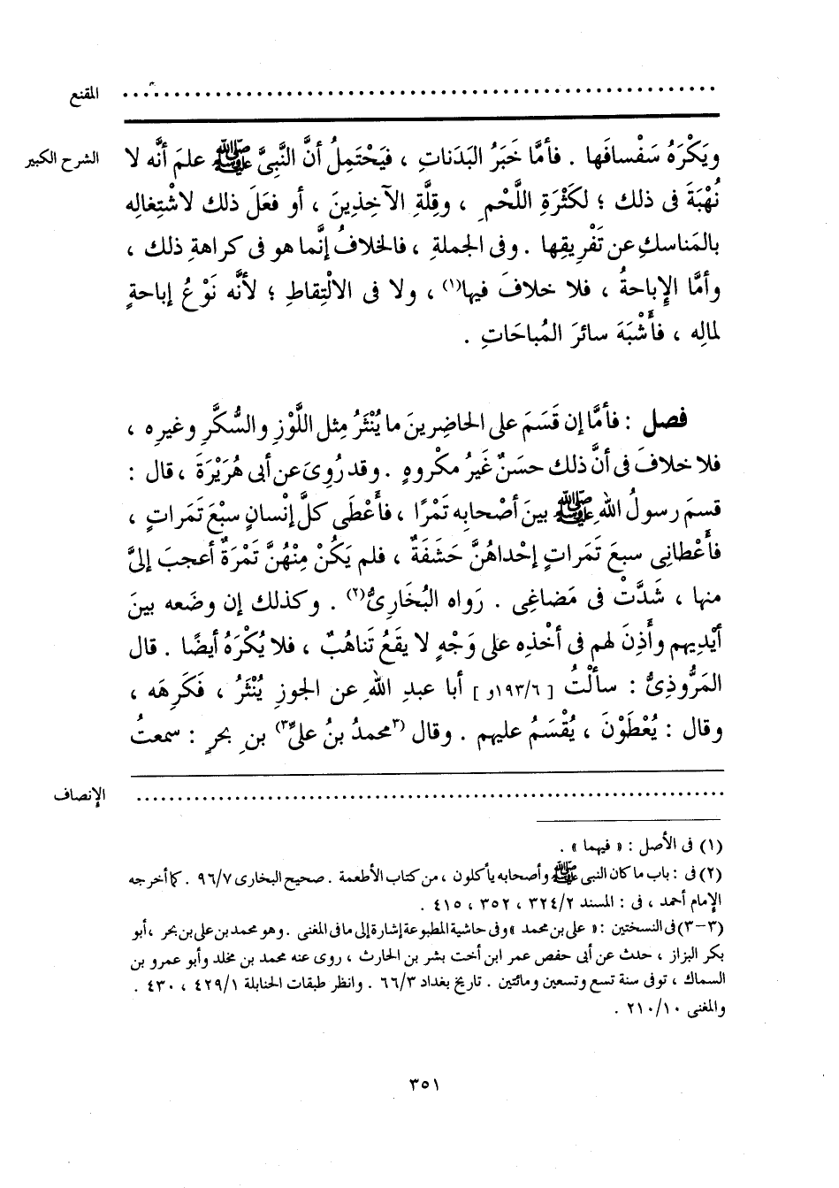 ويَكْرَهُ سَفْسافَها. فأمَّا خَبَرُ البَدَناتِ، فيَحْتَمِلُ أنَّ النَّبِىَّ -صلى اللَّه عليه وسلم- علمَ أنَّه لا نُهْبَةَ في ذلك، لكَثْرَةِ اللَّحْمِ، وقِلَّةِ الآخِذِينَ، أو فعَلَ ذلك لاشْتِغالِه بالمَناسكِ عن تَفْرِيقِها. وفى الجملةِ، فالخلافُ إنَّما هو في كراهةِ ذلك، وأمَّا الإِباحةُ، فلا خلافَ فيها (¬1)، ولا في الالْتِقاطِ، لأنَّه نَوْعُ إباحةٍ لمالِه، فأَشْبَهَ سائرَ المُباحَاتِ.
