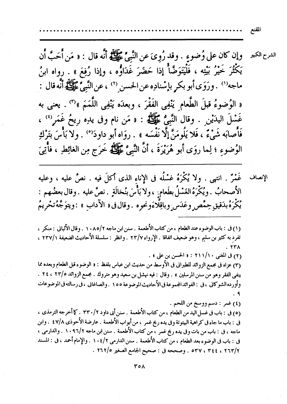 غَمْرٌ. انتهى. ولا يُكْرَهُ غسْلُه فى الإناء الَّذى أكلَ فيه. نصَّ عليه، وعليه الأصحابُ. ويُكْرَهُ الغسْلُ بطَعامٍ، ولا بَأْسَ بنُخالَةٍ. نصَّ عليه. وقال بعضُهم: يُكْرَهُ بدَقيقِ حِمَّصٍ وعَدَسٍ وباقِلَّاءَ ونحوِه. وقال فى «الآدابِ»: ويتوَجَّهُ تحْرِيمُ