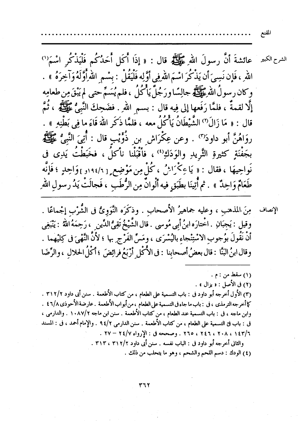مِنَ «المذهبِ»، وعليه جماهيرُ الأصحابِ. وذكَرَه النَّوَوىُّ فى الشُّرْبِ إجْماعًا. وقيلِ: يَجِبَانِ. اخْتارَه ابنُ أبِى مُوسى. قال الشَّيْخُ تَقِىُّ الدِّينِ، رَحِمَهُ اللَّهُ: يَنْبَغِى أَنْ نقُولَ بوُجوبِ الاسْتِنْجاءِ باليُسْرَى، ومَسِّ الفَرْجِ بها؛ لأَنَّ النَّهْىَ فى كِليْهما. وقال ابنُ البَنَّا: قال بعضُ أصحابِنا: فى الأَكْلِ أرْبَعُ فرائِضَ؛ أَكْلُ الحلالِ، والرِّضَا