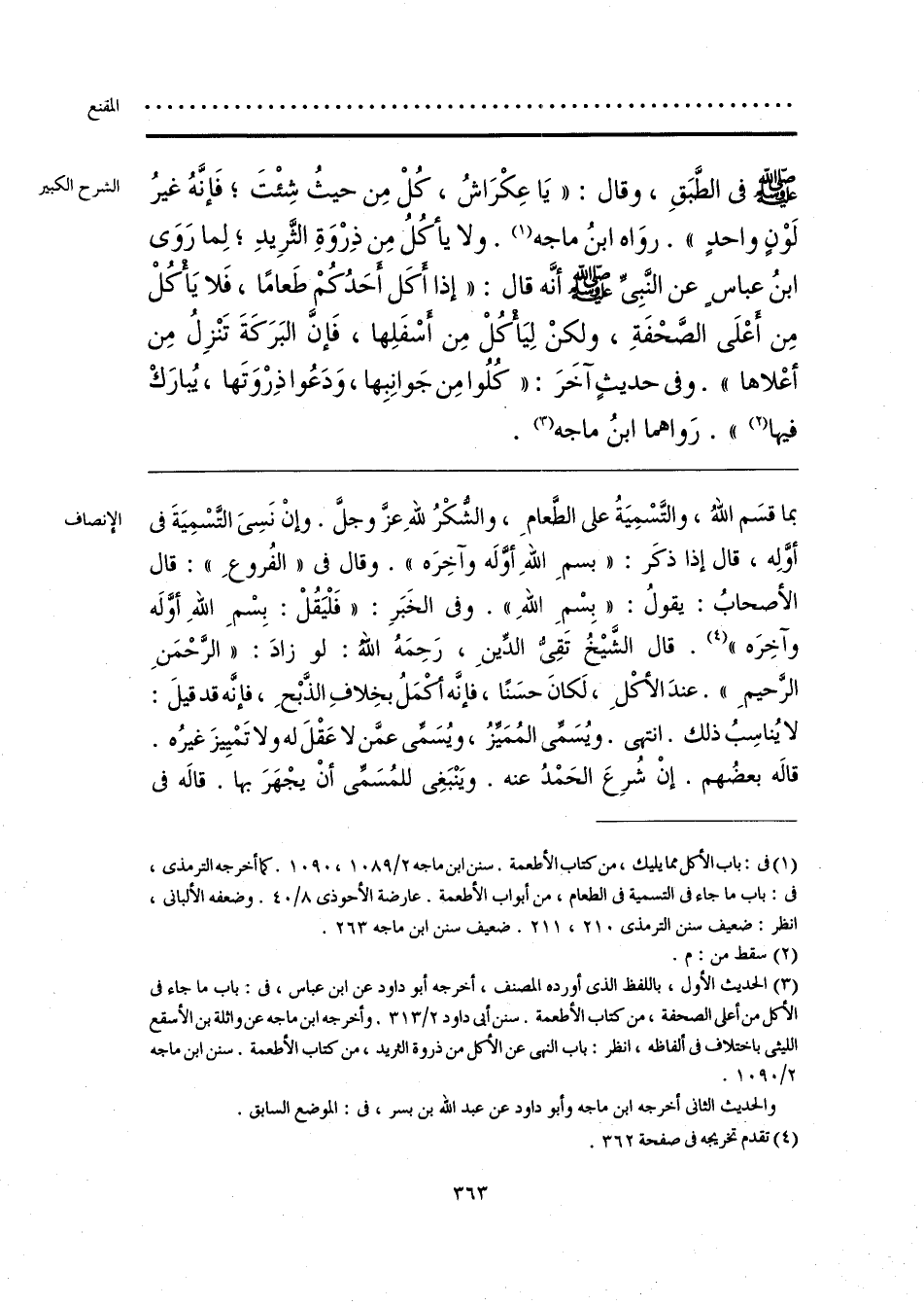 بما قسَم اللَّهُ، والتَّسْمِيَةُ على الطَّعامِ، والشُّكْرُ للَّهِ عزَّ وجلَّ. وإنْ نَسِىَ التَّسْمِيَةَ فى أوَّلِه، قال إذا ذكَر: «بسمَ اللَّهَ أوَّلَه وآخِرَه». وقال فى «الفُروعِ»: قال الأصحابُ: يقولُ: «بِسْمِ اللَّهِ». وفى الخَبَرِ: «فَلْيَقُلْ: بِسْمِ اللَّهِ أوَّلَه وآخِرَه» (¬1). قال الشَّيْخُ تَقِىُّ الدِّينِ، رَحِمَهُ اللَّه: لو زادَ: «الرَّحْمَنِ الرَّحيمِ». عندَ الأَكْلِ، لَكانَ حسَنًا، فإنَّه أكْمَلُ بخِلافِ الذَّبْحِ، فإنَّه قد قيلَ: لا يُناسِبُ ذلك. انتهى. ويُسَمِّى المُمَيِّزُ، ويُسَمِّى عمَّن لا عَقْلَ له ولا تَمْيِيزَ غيرُه. قالَه بعضُهم. إنْ شُرِعَ الحَمْدُ عنه. ويَنْبَغِى للمُسَمِّى أَنْ يجْهَرَ بها. قالَه فى