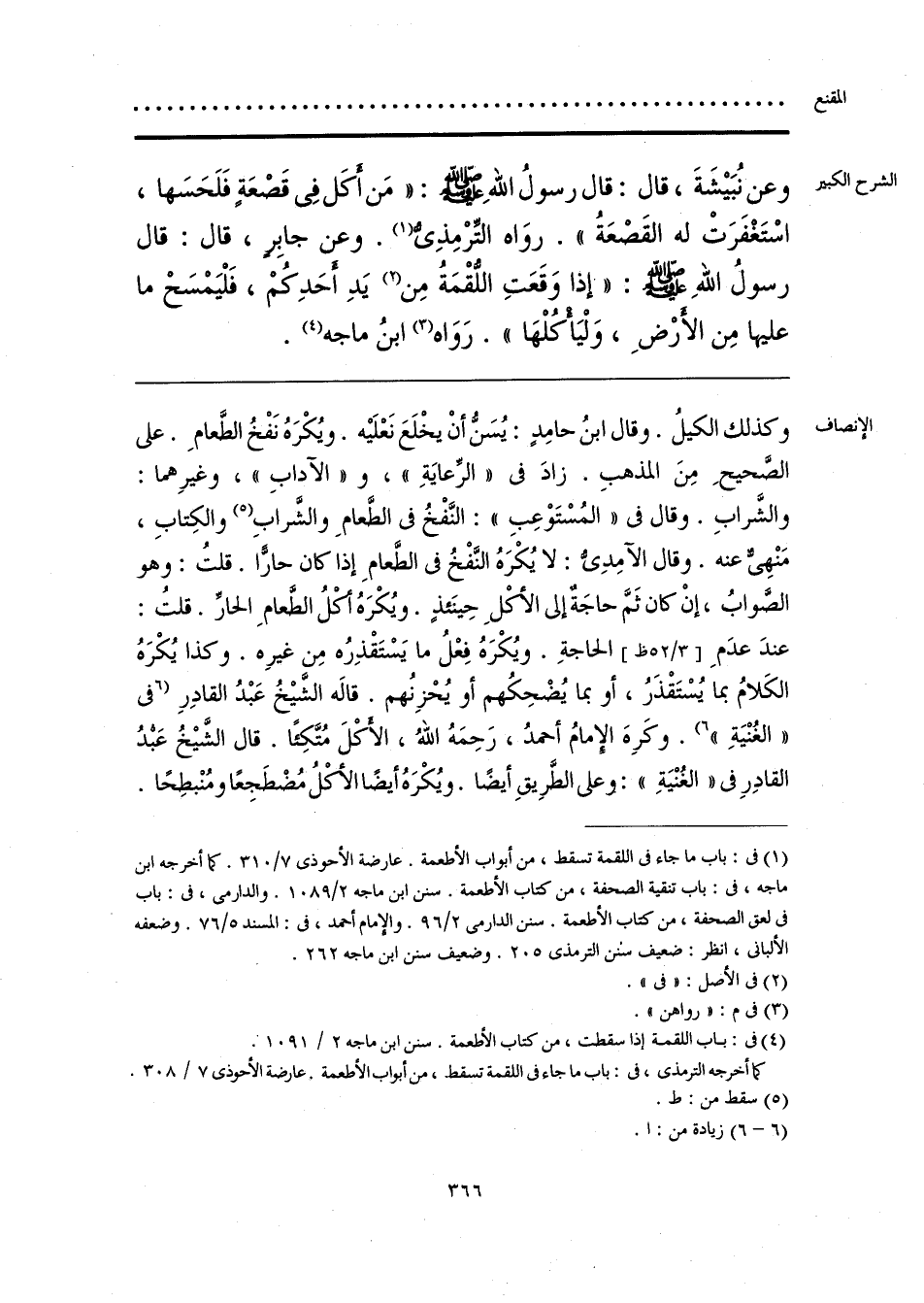 وكذلك الكيلُ. وقال ابنُ حامِدٍ: يُسَنُّ أَنْ يخْلَعَ نَعْلَيْه. ويُكْرَهُ نَفْخُ الطَّعامِ. على الصَّحيحِ مِنَ المذهبِ. زادَ فى «الرِّعايَةِ»، و «الآدابِ»، وغيرِهما: والشَّرابِ. وقال فى «المُسْتَوْعِبِ»: النَّفْخُ فى الطَّعامِ والشَّرابِ (¬1) والكِتابِ، مَنْهِىُّ عنه. وقال الآمِدِى: لا يُكْرَهُ النَّفْخُ فى الطَّعامِ إذا كان حارًّا. قلتُ: وهو الصَّوابُ، إنْ كان ثَمَّ حاجَةٌ إلى الأكْلِ حِينَئذٍ. ويُكْرَهُ الأَكْلُ الطَّعامِ الحارِّ. قلتُ: عندَ عدَمِ الحاجةِ. ويُكْرَهُ فِعْلُ ما يَسْتَقْذِرُه مِن غيرِه. وكذا يُكْرَهُ الكَلامُ بما يُسْتَقْذَرُ، أو بما يُضْحِكُهم أو يُحْزِنُهم. قالَه الشَّيْخُ عَبْدُ القادِرِ [فى «الغُنْيَةِ»] (¬2). وكَرِهَ الإِمامُ أحمدُ، رَحِمَهُ اللَّهُ، الأَكْلَ مُتَّكِئًا. قال الشَّيْخُ عَبْدُ القادِرِ فى «الغُنْيَةِ»: وعلى الطَّرِيقِ أيضًا. ويُكْرَهُ أيضًا الأَكْلُ مُضْطَجِعًا ومُنْبطِحًا.