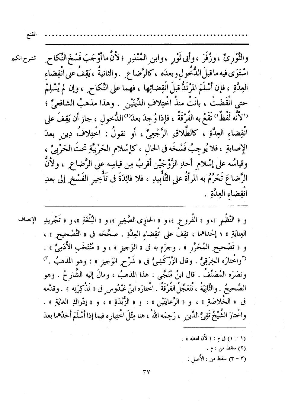 و «النَّظْمِ»، و «الفُروعِ»، و «الحاوي الصَّغِيرِ»، و «البُلْغَةِ»، و «تَجْريدِ العِنايَةِ»؛ إحْداهما، تقِفُ على انْقِضاءِ العِدَّةِ. صحَّحَه في «التَّصْحيحِ»، و «تَصْحيحِ المُحَرَّرِ». وجزَم به في «الوَجيزِ»، و «مُنْتَخَبِ الأدَمِيِّ». [واخْتارَه الخِرَقِيُّ. وقال الزَّرْكَشِيُّ في «شَرْحِ الوَجيزِ»: وهو المذهبُ]. (¬1) ونصَرَه المُصَنِّفُ. قال ابنُ مُنَجَّى: هذا المذهبُ، ومال إليه الشَّارِحُ. وهو الصَّحيحُ. والثّانِيَةُ، تُتَعَجَّلُ الفُرْقَةُ. اخْتارَه ابنُ عَبْدُوسٍ في «تَذْكِرَتِه». وقدَّمه في «الخُلاصَةِ»، و «الرِّعايتَين»، و «الزُّبْدَةِ»، و «إدْراكِ الغايَةِ». واخْتارَ الشَّيخُ تَقِيُّ الدِّينِ، رَحِمَه اللهُ، هنا مِثْلَ اخْتِيارِه فيما إذا أسْلَمَ أحدُهما بعدَ