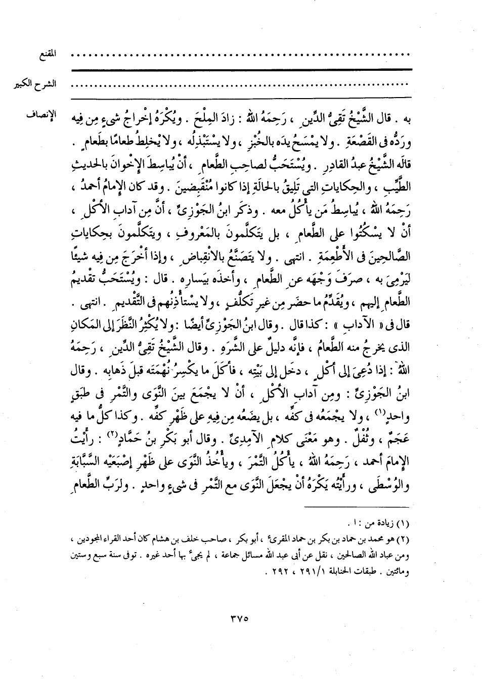 به. قال الشَّيْخُ تَقِىُّ الدِّينِ، رَحِمَهُ اللَّه: زادَ المِلْحَ. ويُكْرَهُ إخْراجُ شئٍ مِن فِيه ورَدُّه فى القَصْعَةِ. ولا يمْسَحُ يدَه بالخُبْزِ، ولا يسْتَبْذِلُه، ولا يْخلِطُ طعامًا بطعامٍ. قالَه الشَّيْخُ عبدُ القادِرِ. ويُسْتَحَبُّ لصاحِبِ الطَّعامِ، أَنْ يُباسِطَ الإِخْوانَ بالحديثِ الطَّيِّبِ، والحِكاياتِ التى تَلِيقُ بالحايَةِ إذا كانوا مُنْقَبِضينَ. وقد كان الإِمامُ أحمدُ، رَحِمَهُ اللَّه، يُباسِطُ مَن يأْكُلُ معه. وذكَر ابنُ الجَوْزِىِّ، أنَّ مِن آدابِ أكْلِ، أَنْ لا يسْكُتُوا على الطَّعامِ، بل يتَكلَّمونَ بالمَعْروفِ، ويتَكلَّمونَ بحِكاياتِ الصَّالحِينَ فى الأَطْعِمَةِ. انتهى. ولا يتَصَنَّعُ بالانْقِباضِ، وإذا أخْرَجَ مِن فِيه شيئًا ليَرْمِىَ به، صرَفَ وَجْهَه عنِ الطَّعامِ، وأخذَه بيَسارِه. قال: ويُسْتَحَبُّ تقْديمُ الطَّعامِ إليهم، ويُقَدِّمُ ما حضَر مِن غيرِ تَكلُّفٍ، ولا يسْتأْذِنُهم فى التَّقْديمِ. انتهى. قال فى «الآدابِ»: كذا قال. وقال ابنُ الجَوْزِىِّ أيضًا: ولا يُكْثِرُ النَّظَرَ إلى المَكانِ الَّذى يخرجُ منه الطَّعامُ، فإنّه دليلٌ على الشَّرَهِ. وقال الشَّيْخُ تَقِىُّ الدِّينِ، رَحِمَهُ اللَّهُ: إذا دُعِىَ إلى أكْلٍ، دخَل إلى بَيْتِه، فأكَلَ ما يكْسِرُ نُهْمَتَه قبل ذَهابِه. وقال ابنُ الجَوْزِىِّ: ومِن آدابِ الأكْلِ، أَنْ لا يجْمَعَ بينَ النّوَى والتَّمْرِ فى طبَقٍ واحدٍ (¬1)، ولا يجْمَعُه فى كفِّه، بل يضَعُه مِن فِيهِ على ظَهْرِ كفِّه. وكذا كل ما فيه عَجَمٌ، وثُفْلٌ. وهو مَعْنَى كلامِ الآمِدِىُّ. وقال أبو بَكْرِ بنُ حَمَّادٍ (¬2): رأَيْتُ الإِمامَ أحمد، رَحِمَهُ اللَّهُ، يَأْكُلُ التَّمْرَ، ويأْخُذُ النَّوَى على ظَهْرِ إصْبَعَيْه السَّبَّابَةِ والوُسْطَى، ورأيْتُه يَكْرَهُ أَنْ يجْعَلَ النَّوَى مع التَّمْرِ فى شئٍ واحدٍ. ولرَبِّ الطَّعامِ